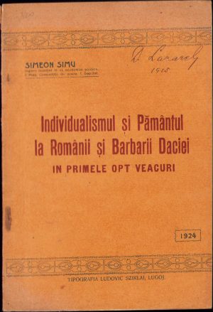 Individualismul și Pământul la Românii și Barbarii Daciei în primele opt veacuri de Simeon Simu, 1924, Tipografia Ludovic Sziklai, Lugoj