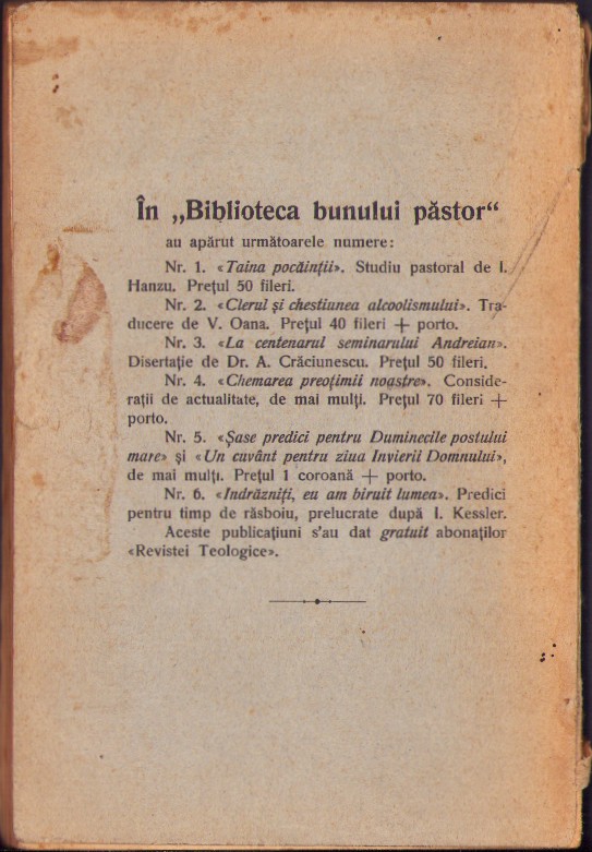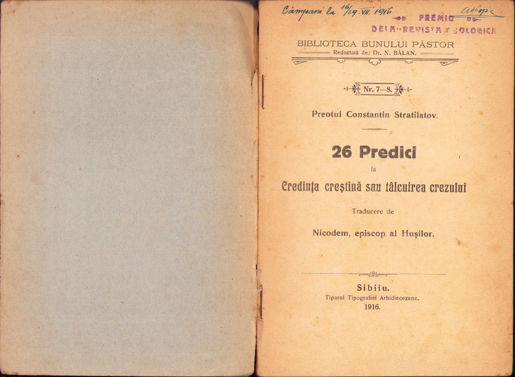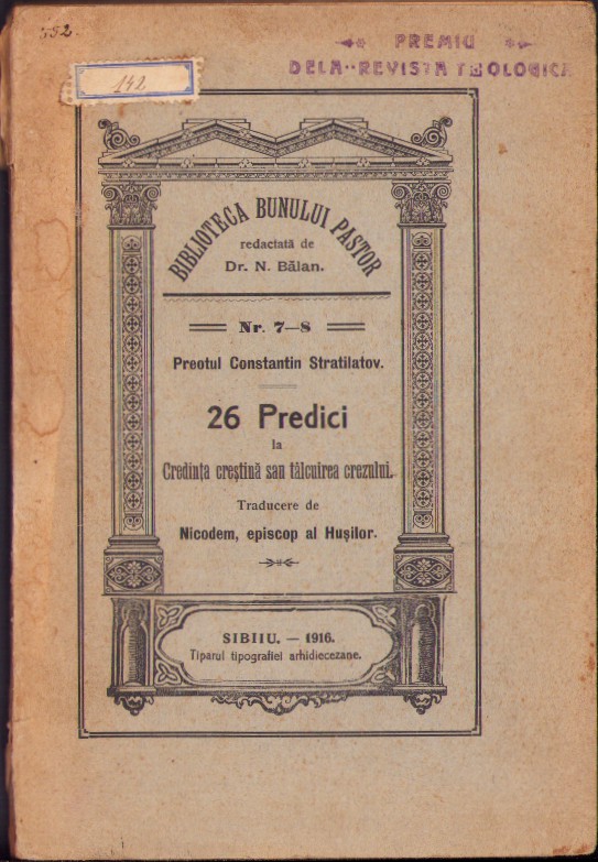 26 Predici la Credința creștină sau tâlcuirea Crezului de preot Constantin Stratilatov, traducere de Nicodem, episcop al Hușilor, 1916, cu semnătura olografă a lui Atanasie Popa.
