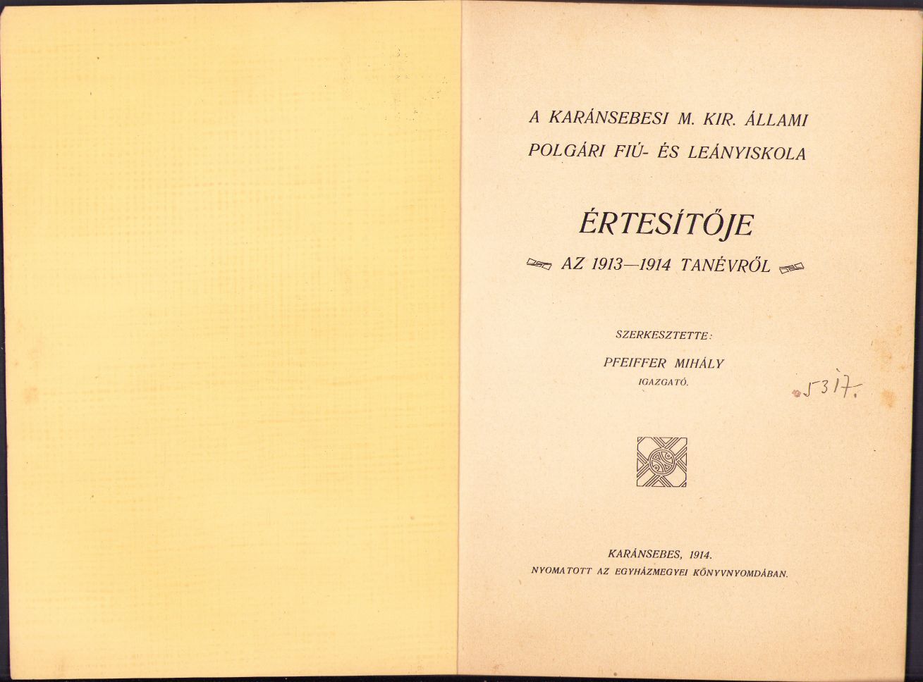 A karánsebesi m kir állami polgári fiú és leányiskola értésitője az 1913-1914 tanévről, szerkesztette Pfeiffer Mihály igazgató, Caransebeș.