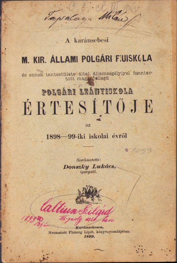 A karánsebesi m kir állami polgári fiúiskola és ennek tantestülete által államsegélylyel fenntartott magánjellegü polgáry leányiskola értésitője az 1898-99-iki iskolai évről, szerkesztette Donszky Lukács, Caransebeș.