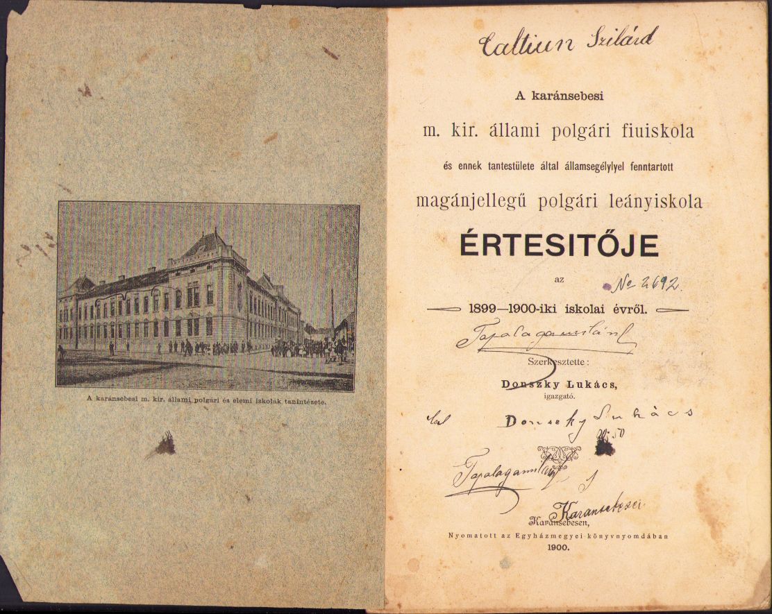 A karánsebesi m kir állami polgári fiúiskola és ennek tantestülete által államsegélylyel fenntartott magánjellegü polgáry leányiskola értésitője az 1899-1900-iki iskolai évről, szerkesztette Donszky Lukács igazgató, Caransebeș.