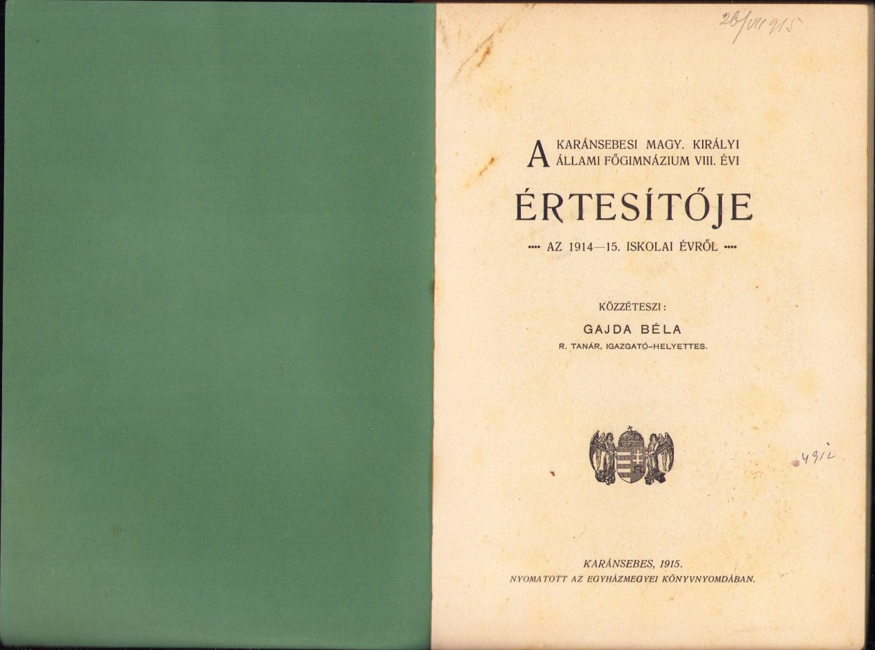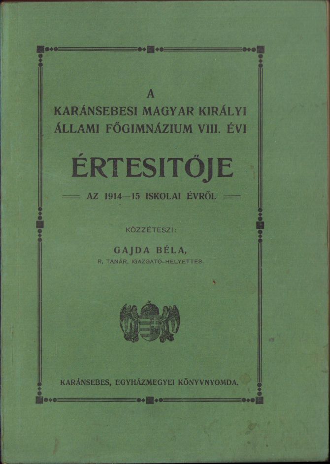 A karánsebesi magyar király állami főgymnazium VIII évi értésitője az 1914-1915 iskolai évről, közzéteszi Gajda Béla, Caransebeș.
