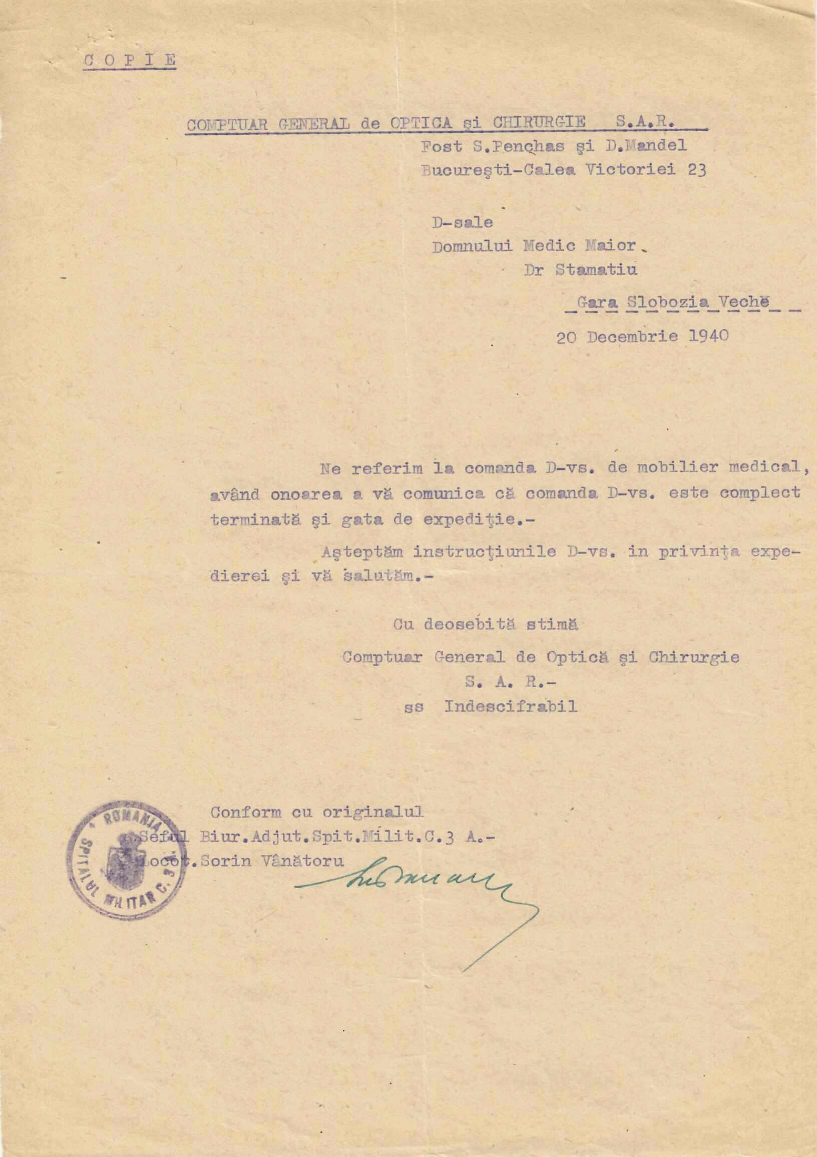 Act cu ștampila Spitalului Militar al Corpului 3 Armată, 1940.