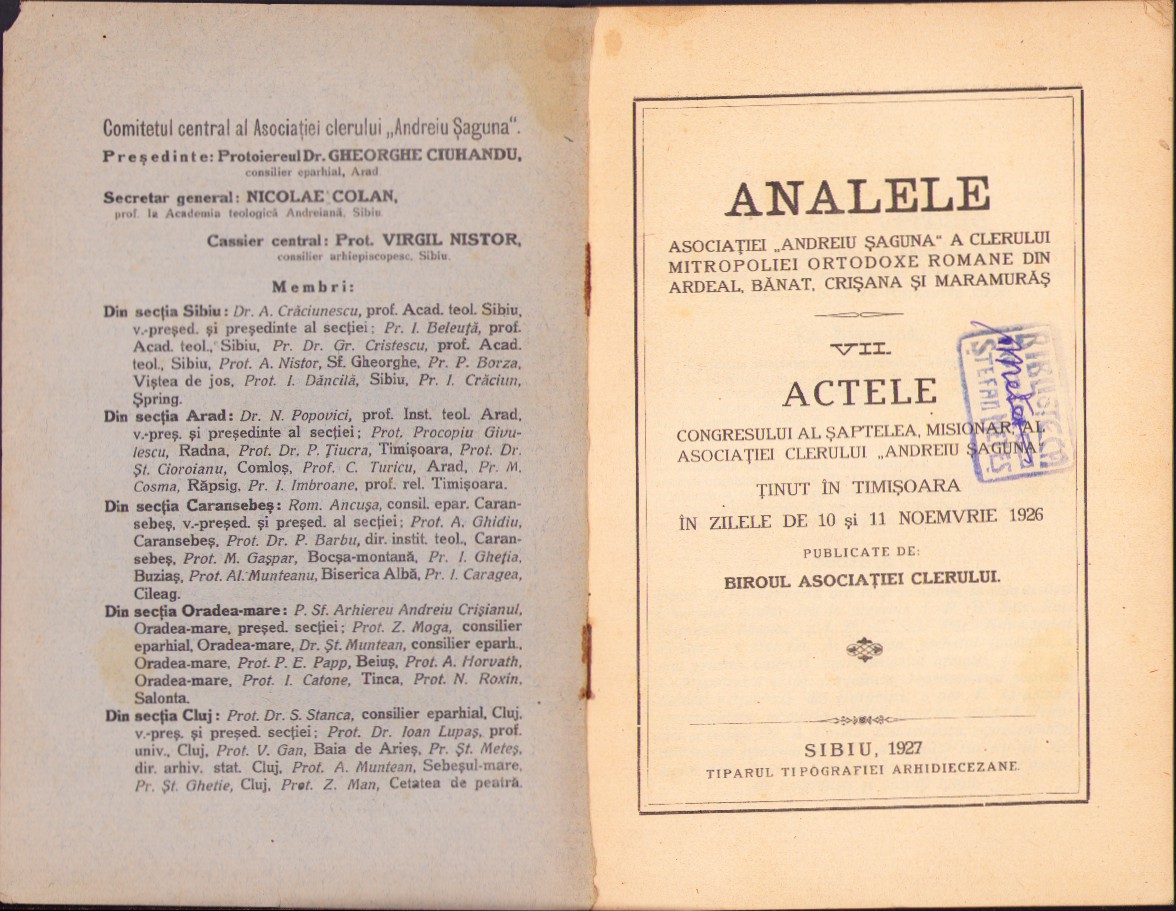Actele Congresului al șaptelea, misionar, al Asociației Clerului Andreiu Șaguna ținut în Timișoara în zilele de 10 și 11 noemvrie 1926, cu semnătura olografă a lui Ștefan Meteș și ex-libris-ul său, Tiparul tipografiei arhidiecezane, Sibiu, 1927.