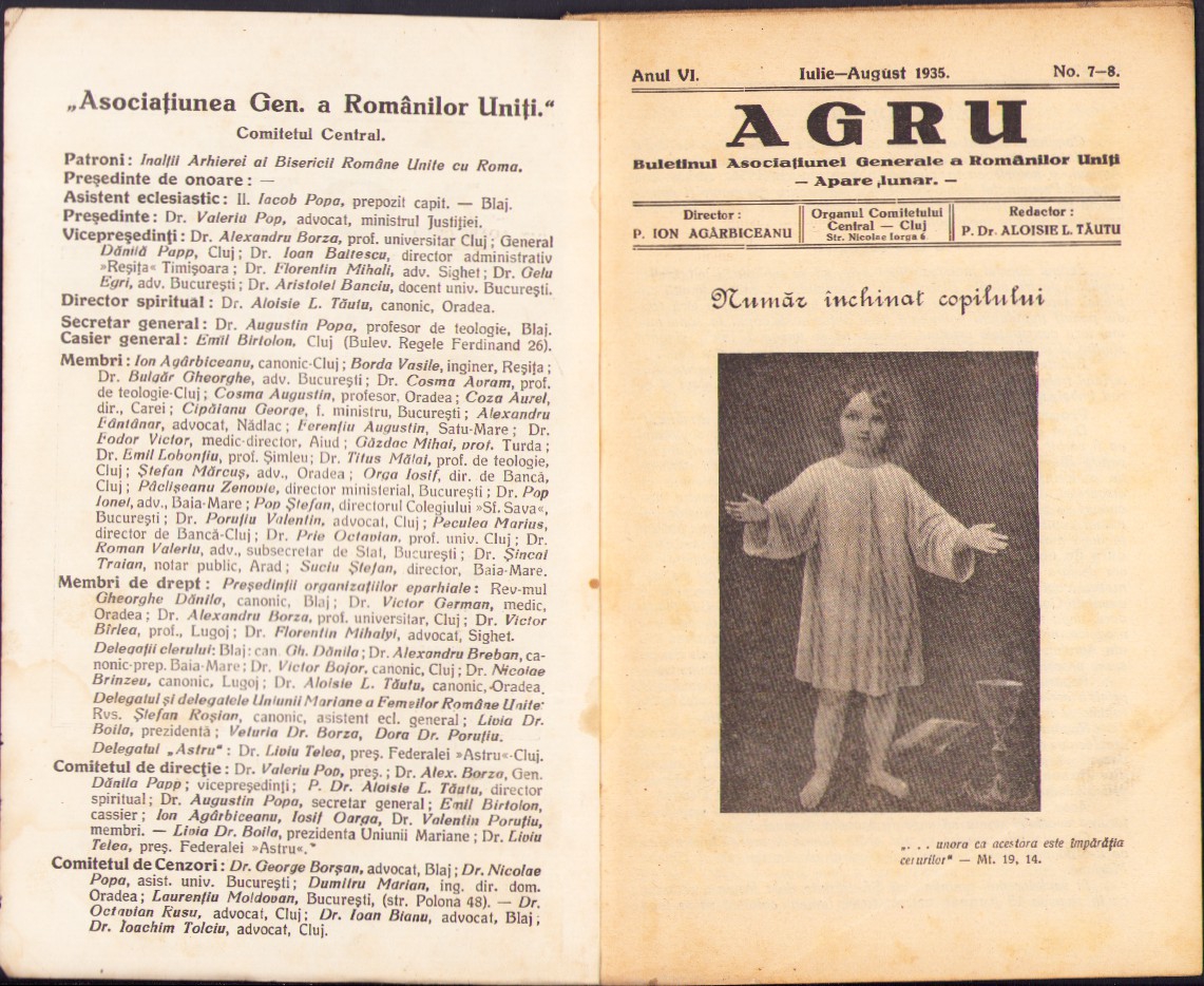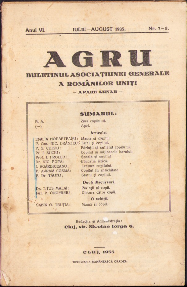 AGRU, Buletinul Asociațiunei Generale a Românilor Uniți, 7-8/1935, număr închinat copilului, Cluj, Tipografia Românească Oradea.
