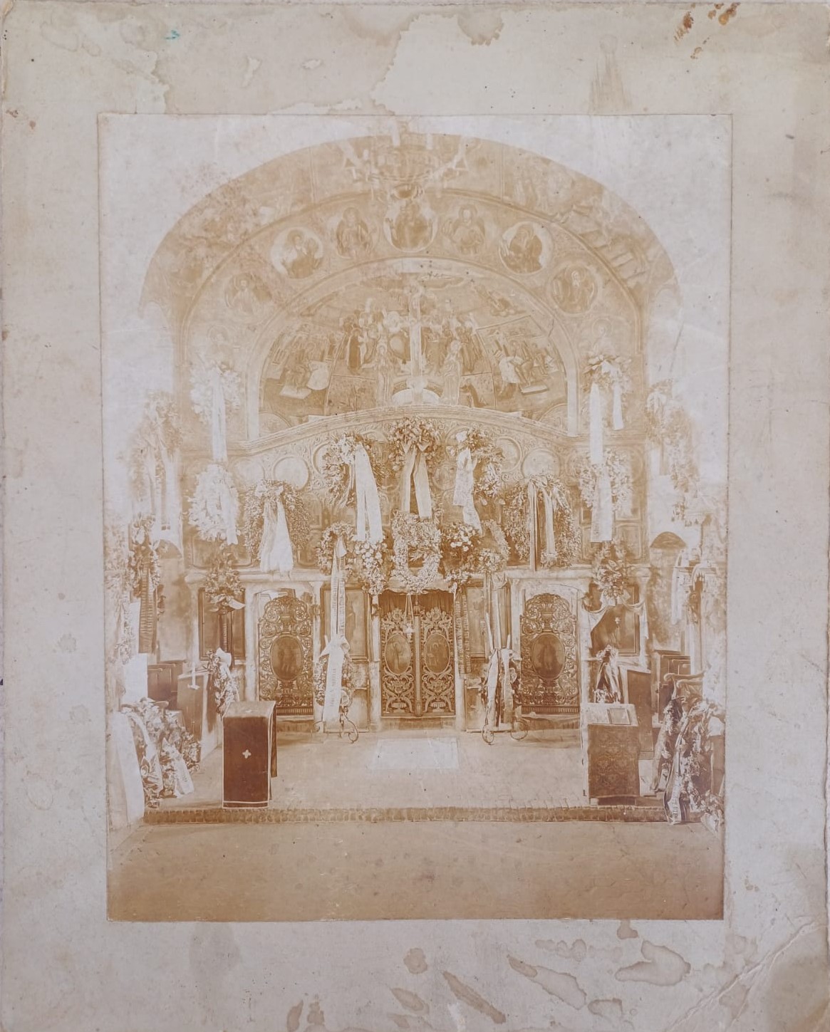 Altarul bisericii ortodoxe Sfântul Ioan Botezătorul din Caransebeș la moartea episcopului Ioan Popasu, 1889, cu coroanele depuse de diverse instituții, după cum se poate citi pe panglicile lor – Eforia Școalelor, Societatea de lectură, Corpul ofițeresc și altele.