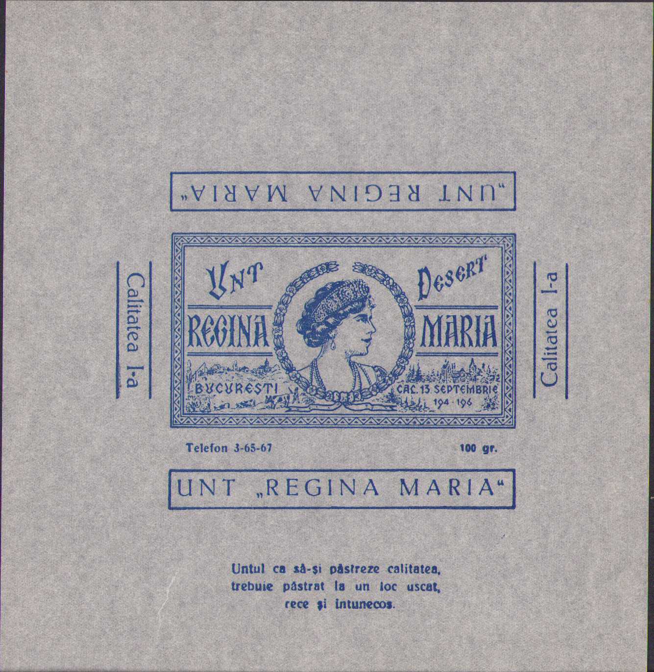 Ambalaj de unt desert „Regina Maria”, calitatea I, 100 gr., interbelic