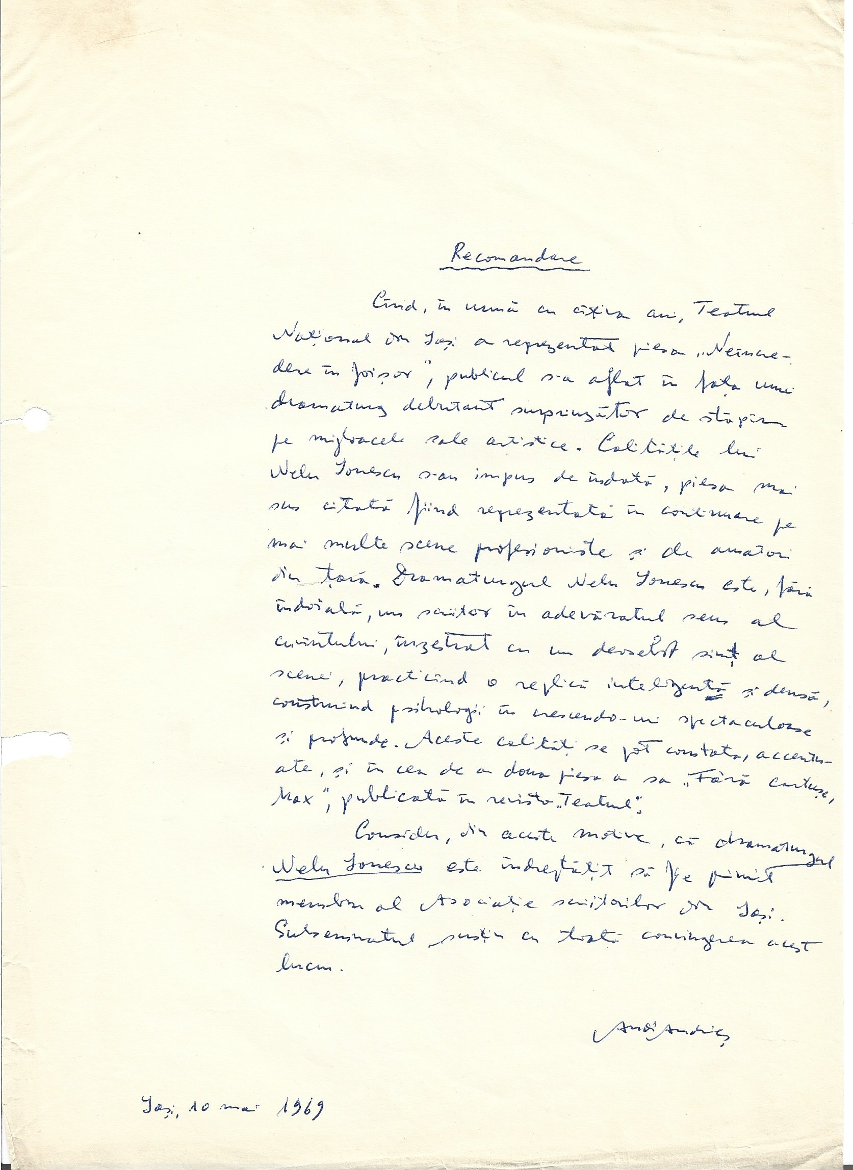Andi Andrieș, act scris și semnat olograf, 1969, Iași
