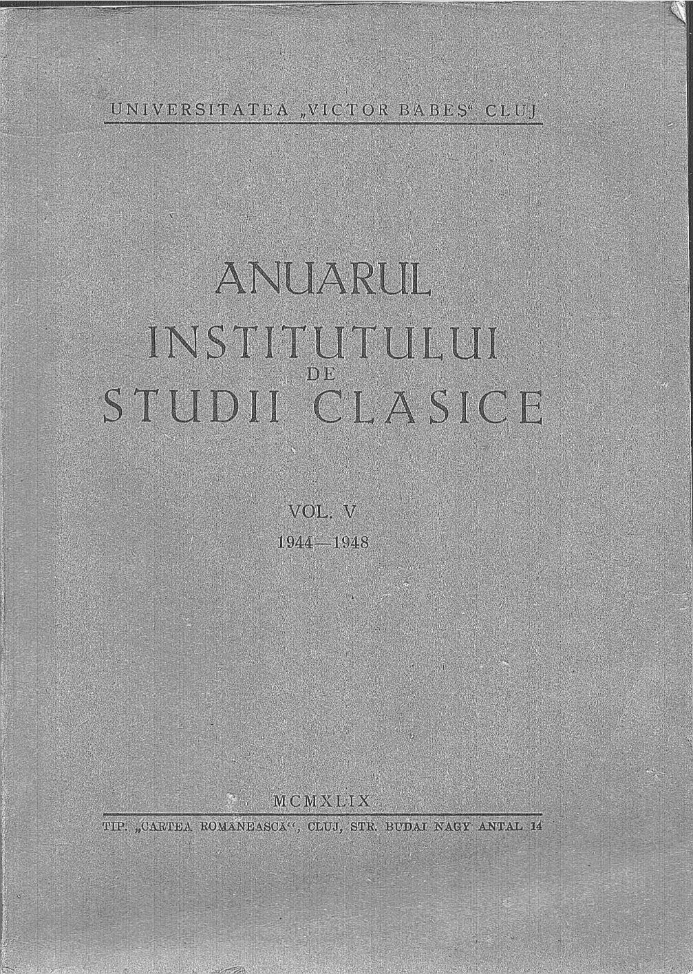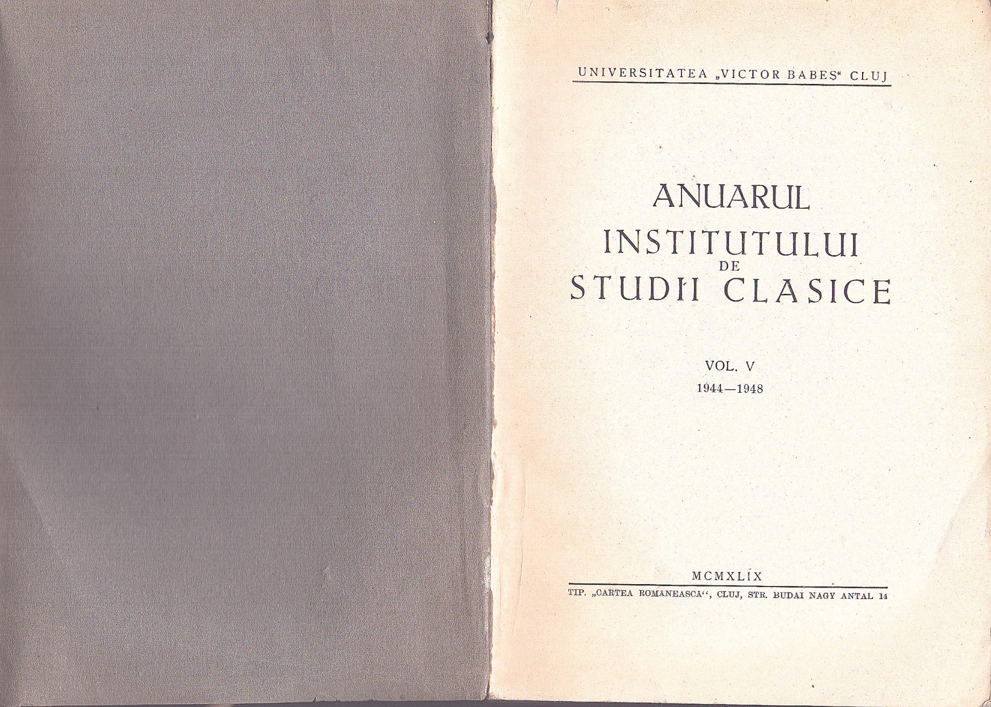 Anuarul Institutului de Studii Clasice, volumul V (1944-1948), 1949, Universitatea Victor Babeș, Cluj.