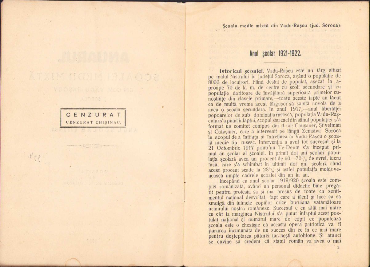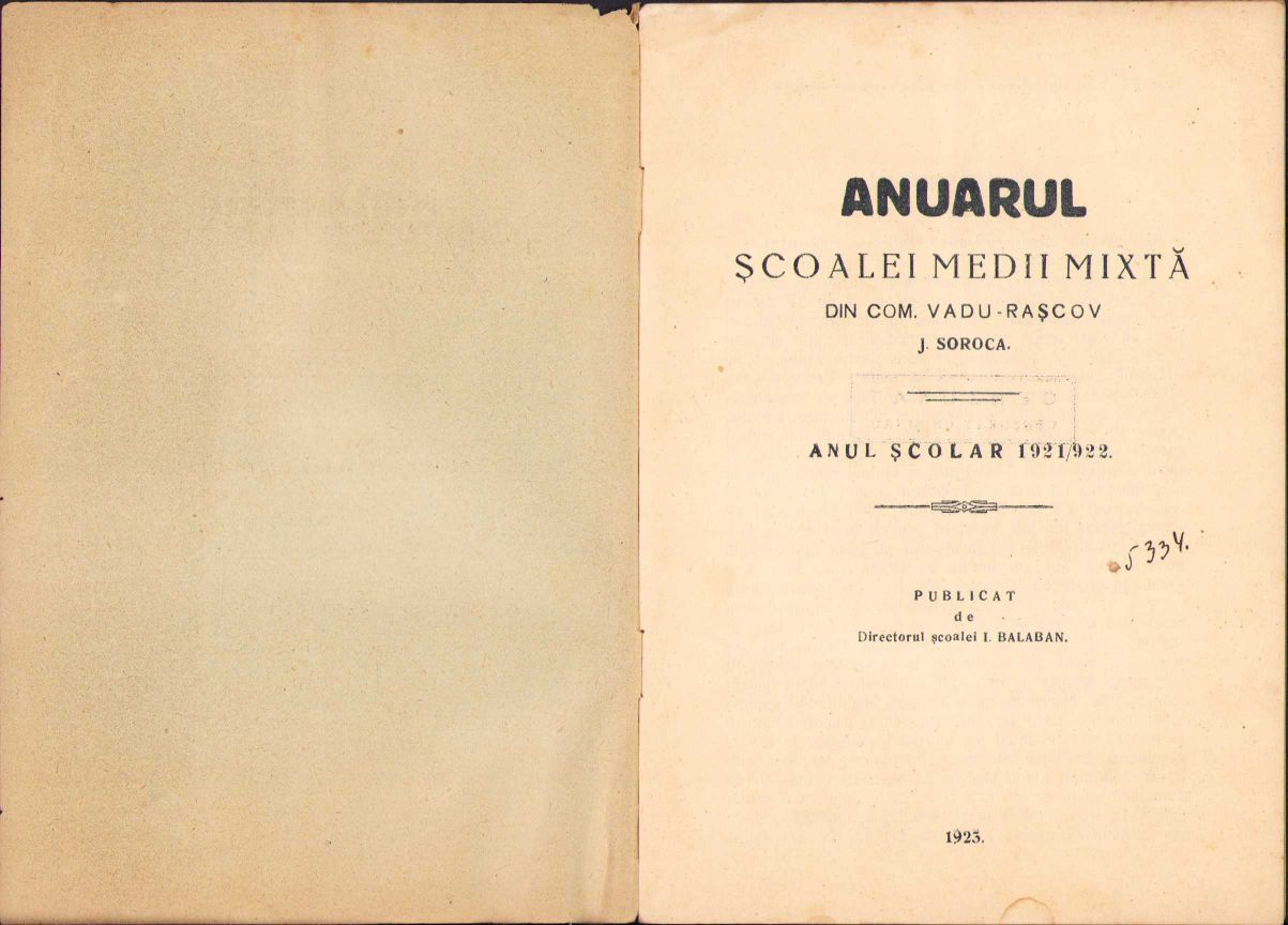 Anuarul Școalei medii mixtă din com Vadu-Rașcov j Soroca, anul școlar 1921/922 de I Balaban, 1923.