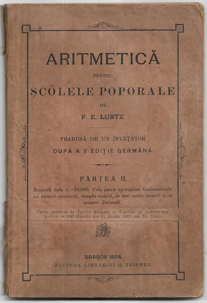 Aritmetică pentru șcólele poporale de F E Lurtz tradusă de un învețător, 1894, Brașov.
