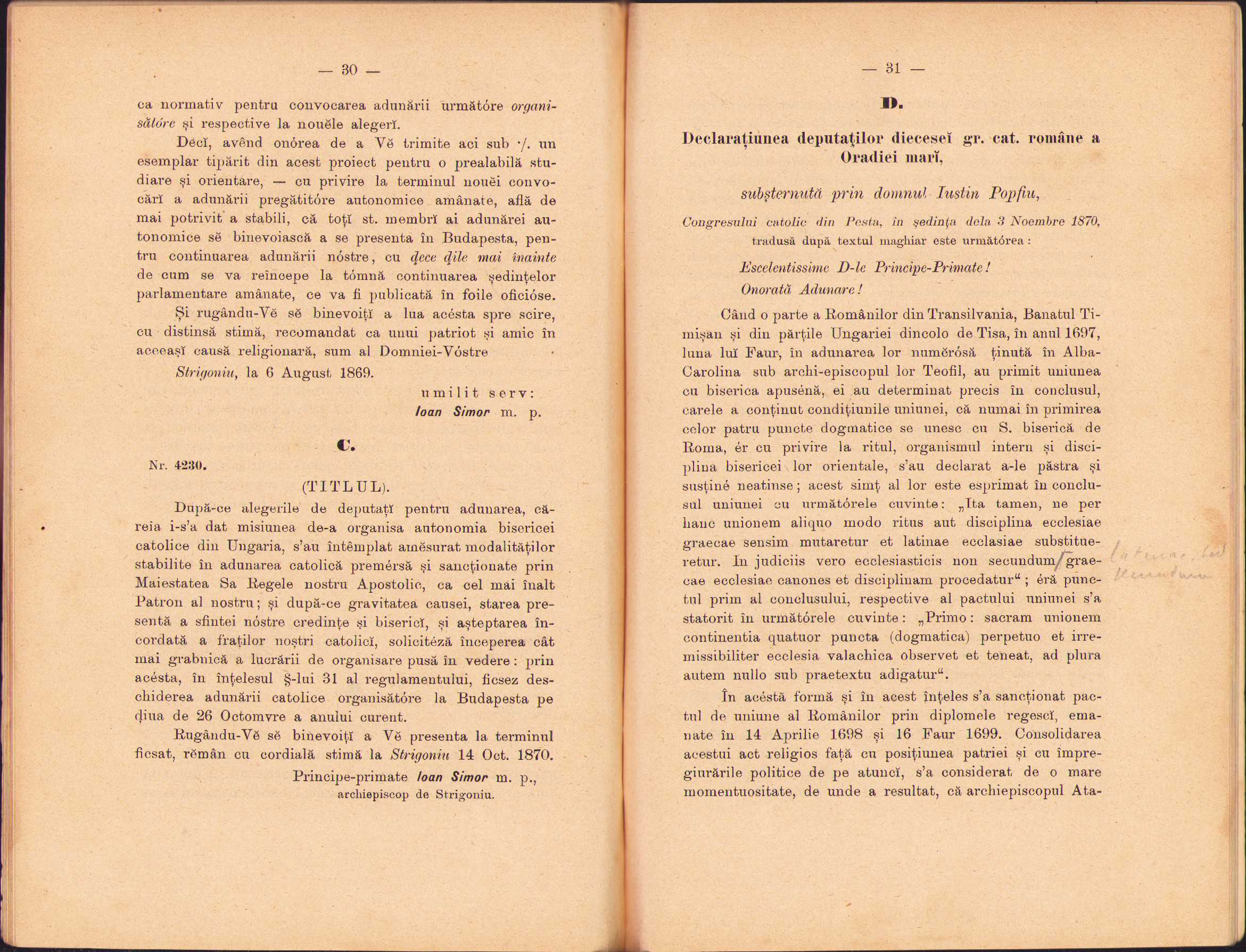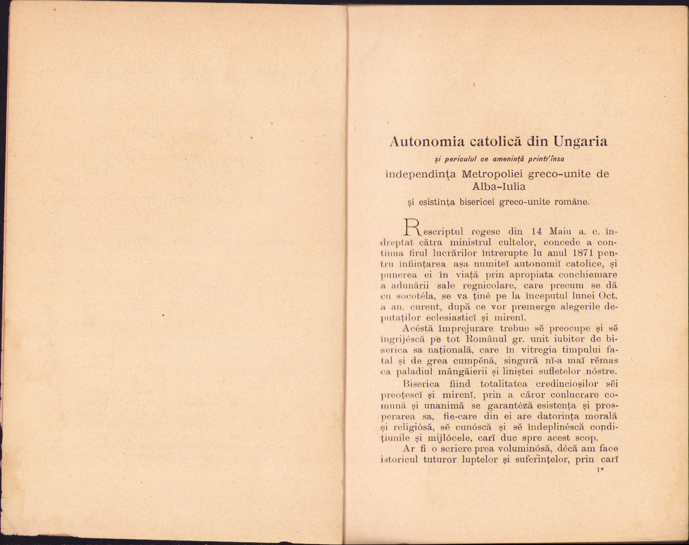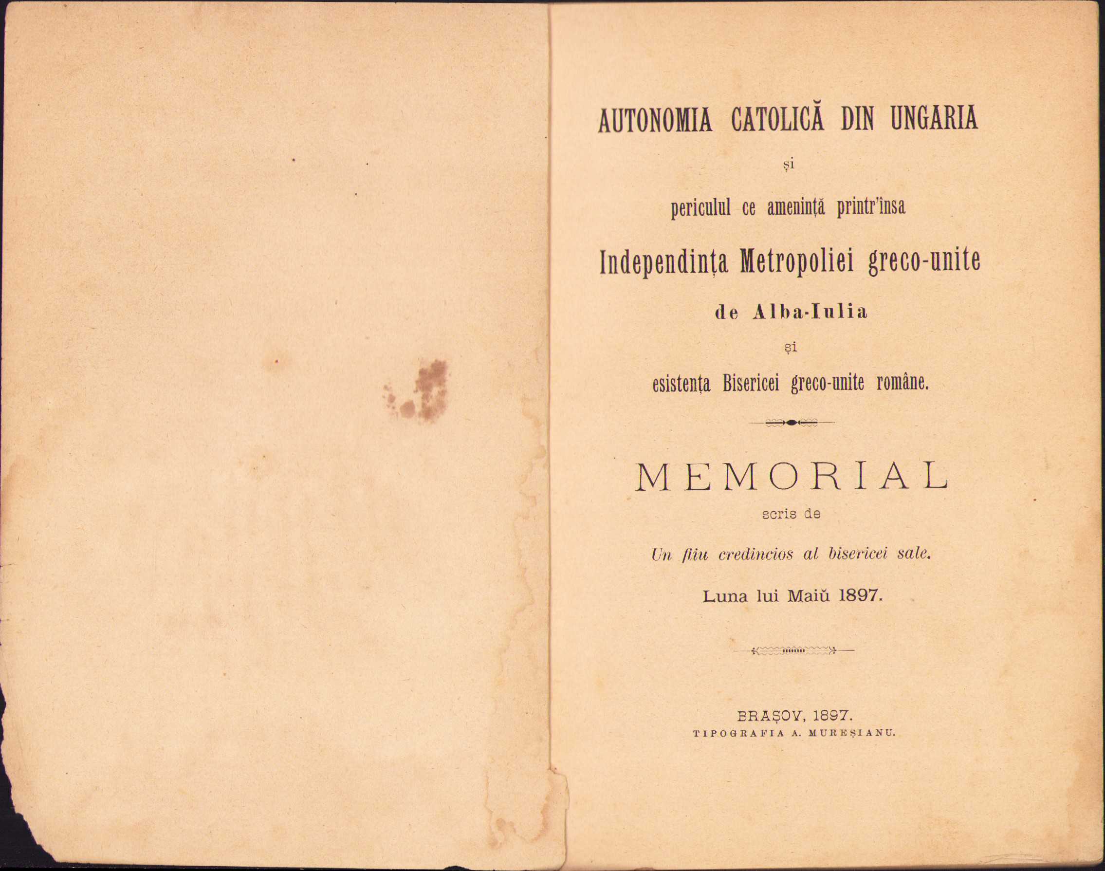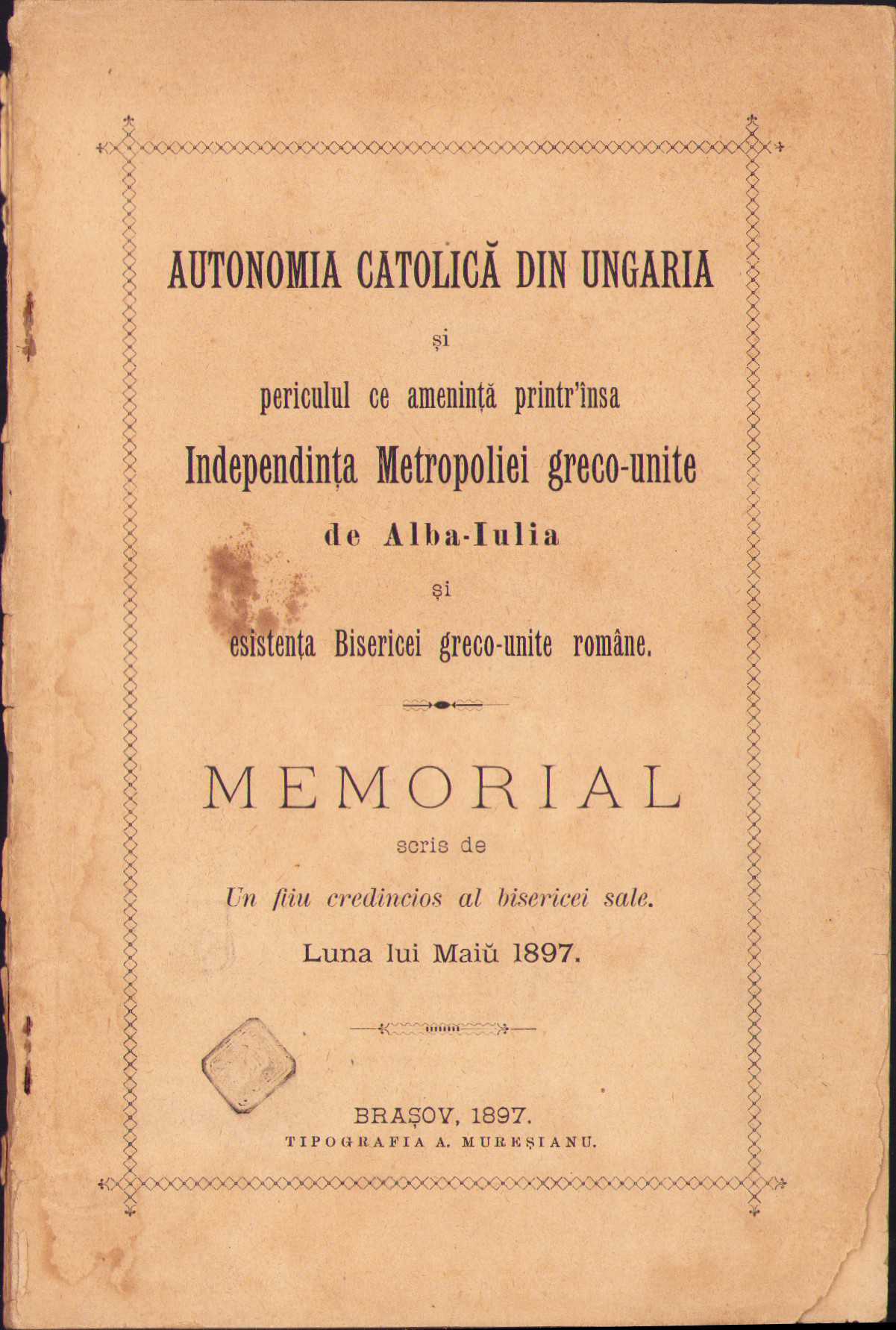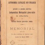Autonomia catolică din Ungaria și periculul ce amenință printr-însa Independința Metropoliei Greco-Unite de Alba Iulia, memorial scris de un fiiu credincios al bisericei sale, 1897, Brașov, Tipografia Mureșianu