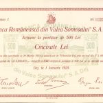 Banca Românească din Valea Someșului SA Dej, Emisiunea I, 1925, acțiune la purtător de 500 lei.