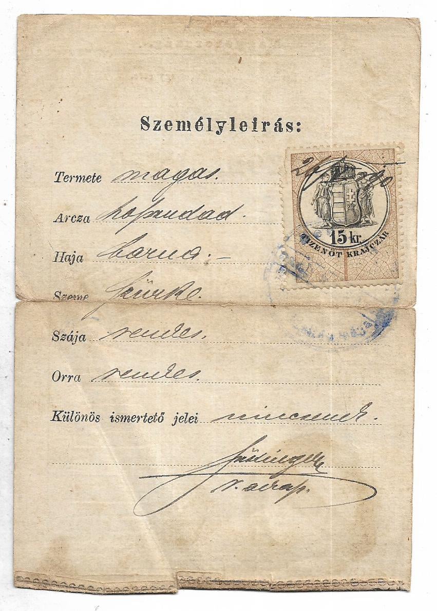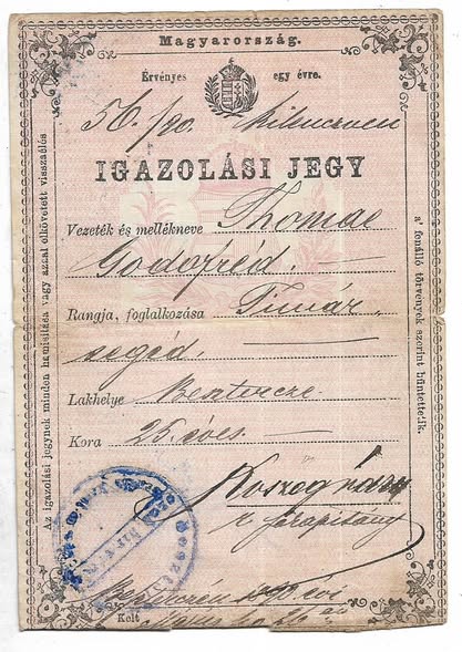 Bilet de identitate, Bistrița, 1890, pentru un ajutor de tăbăcar