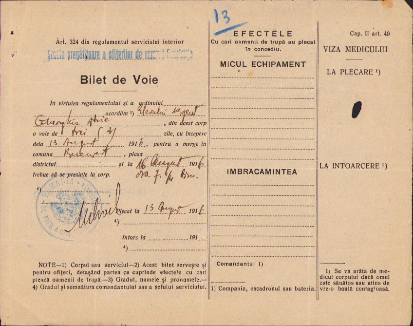 Bilet de voie, august 1916, Școala pregătitoare a ofițerilor de rezervă Constanța.