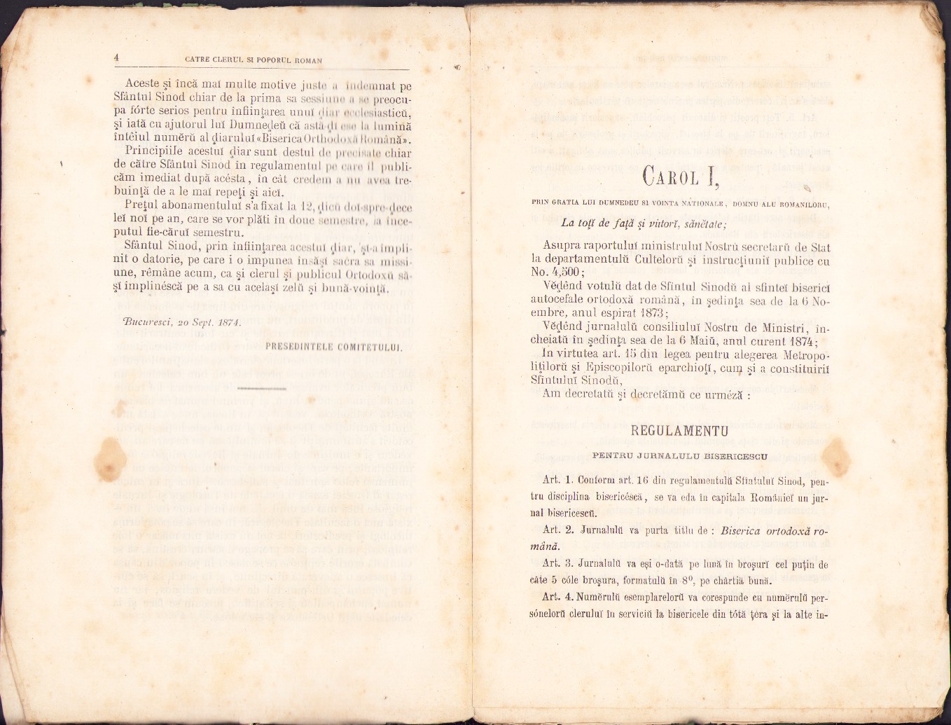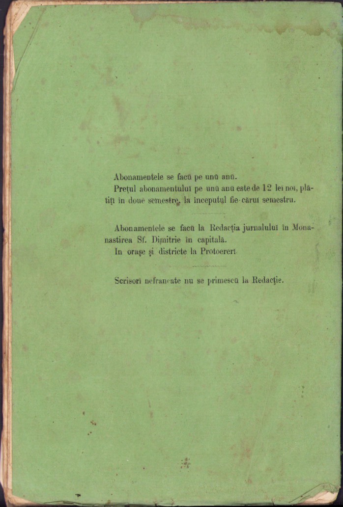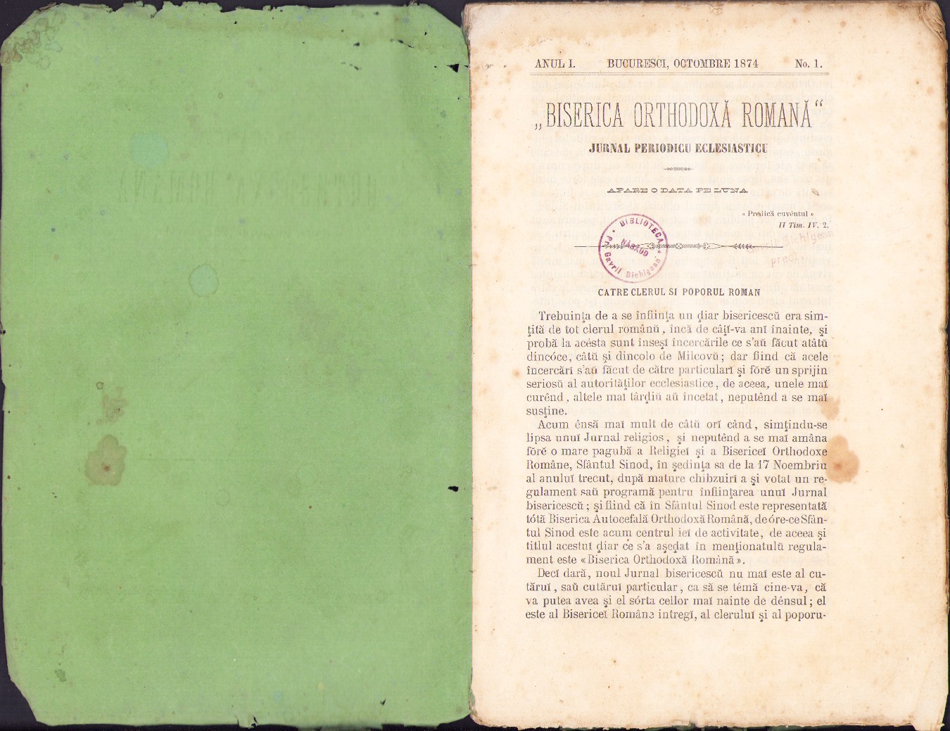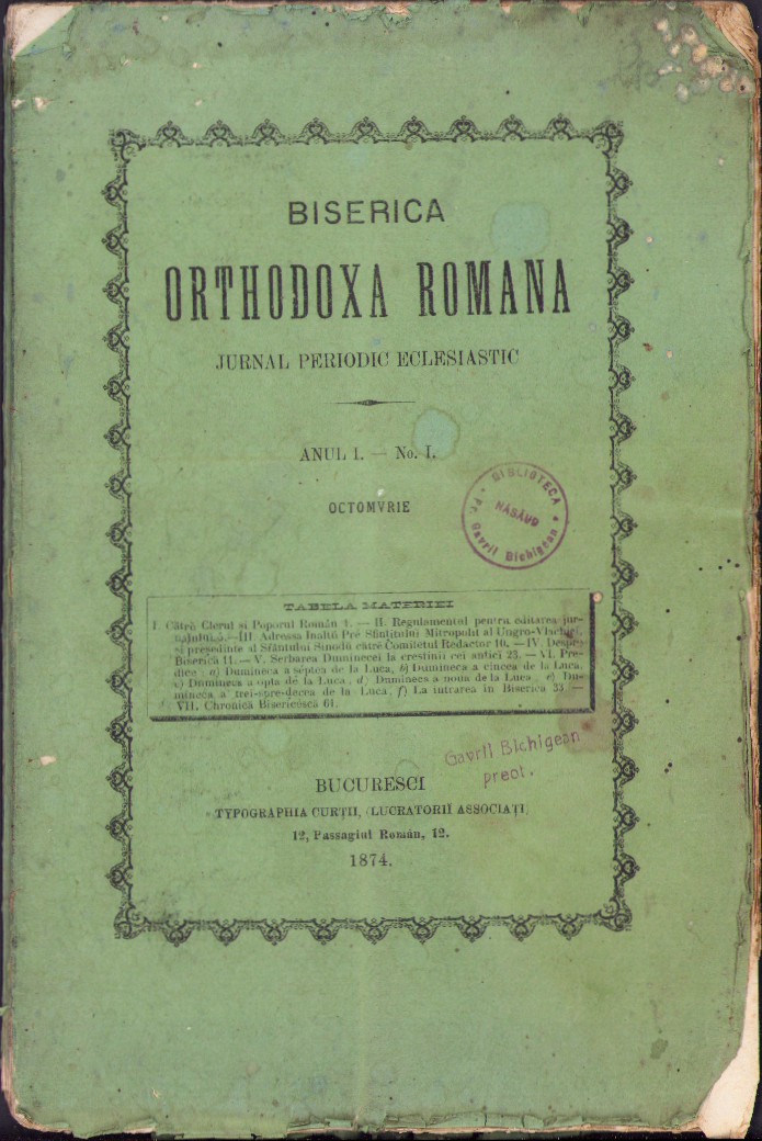 Biserica Orthodoxă Română, jurnal periodic eclesiastic, anul I, numărul 1, 1874, Bucuresci.