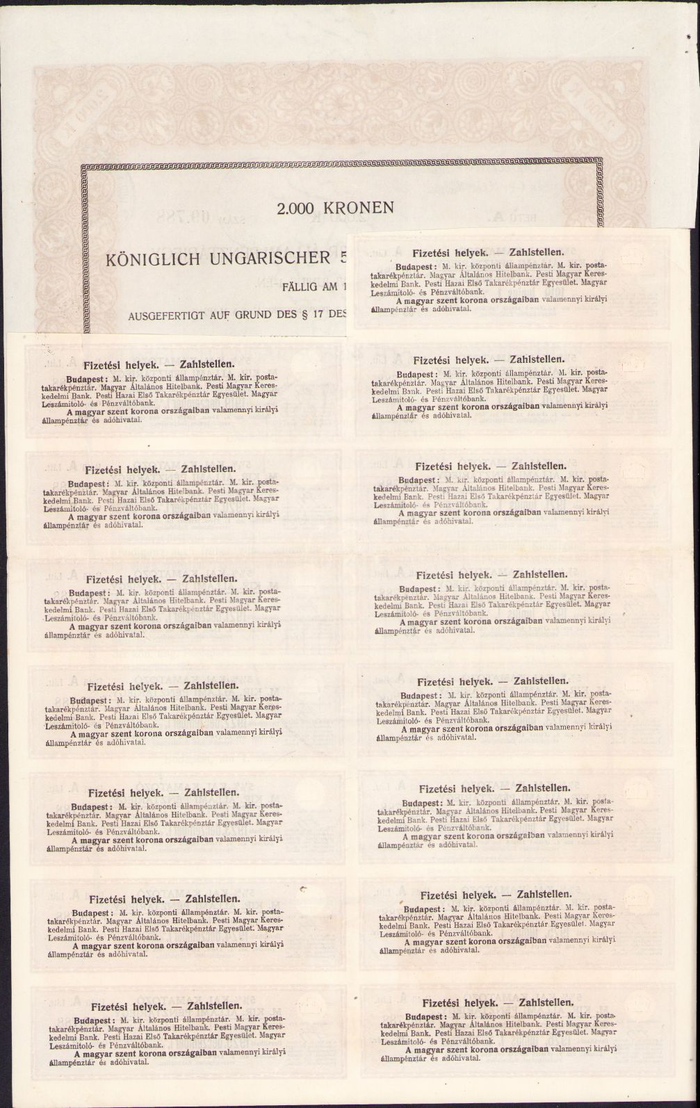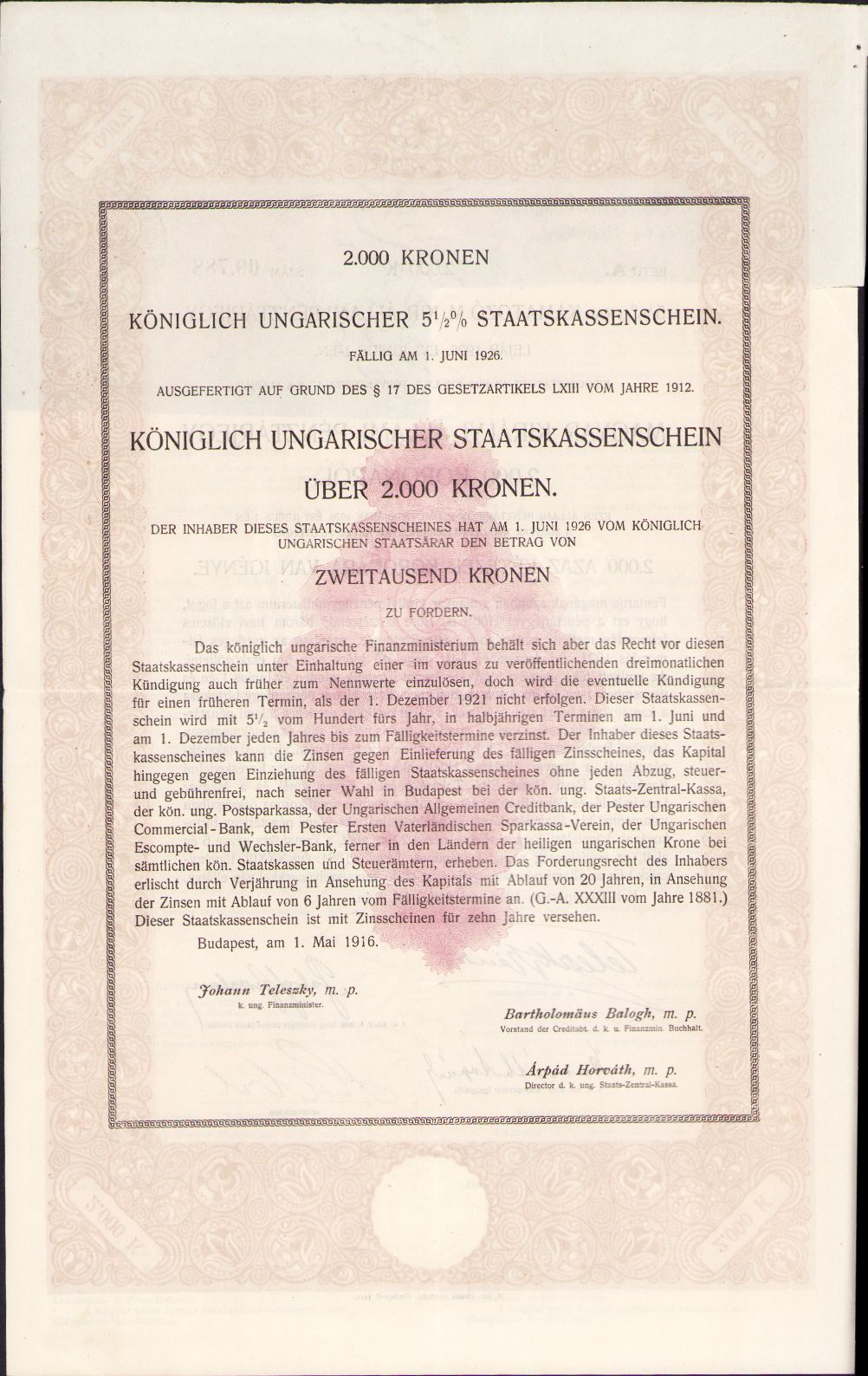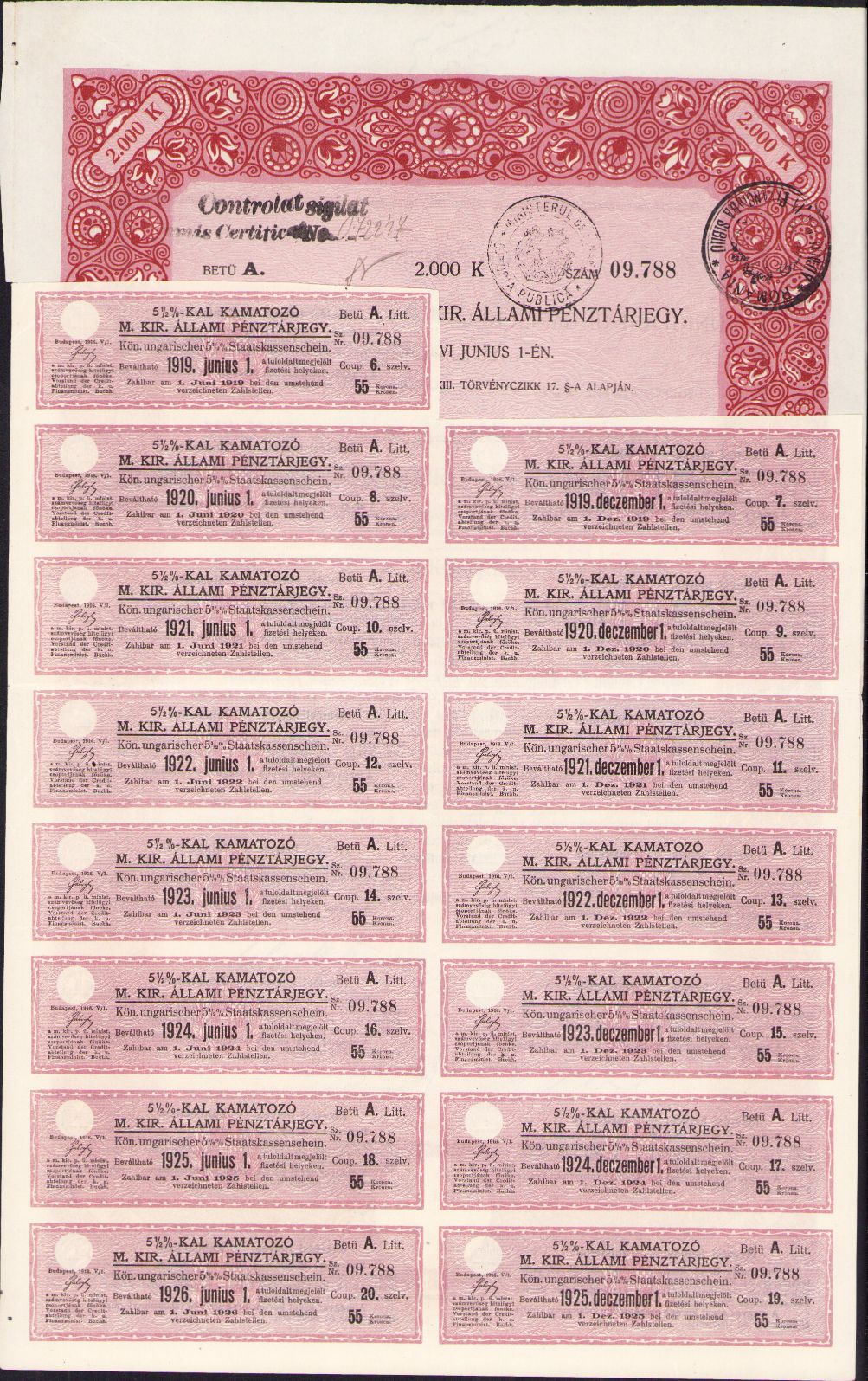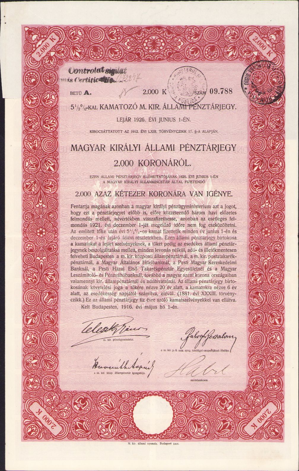 Bon de trezorerie austro-ungar, 1916, Banca regală maghiară de stat, cu supraștampile românești „România Administrația Financiară Sibiu”, „Ministerul de Finanțe Datoria publică” și „Controlat sigilat emis certificat No.”.