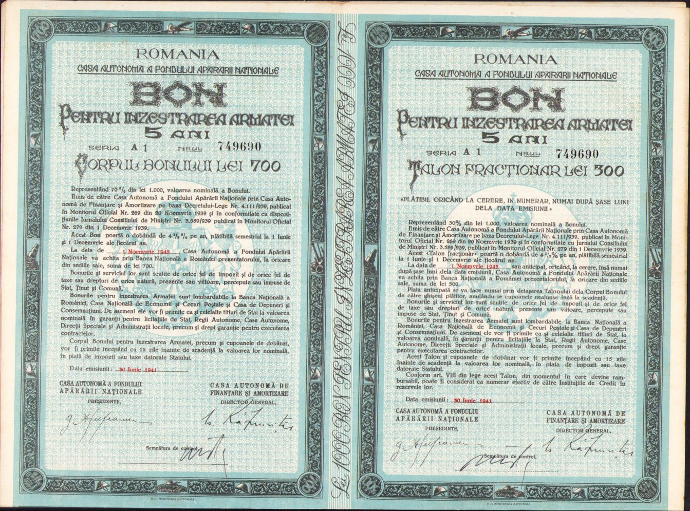 Bon pentru înzestrarea armatei 5 ani de 1000 lei.