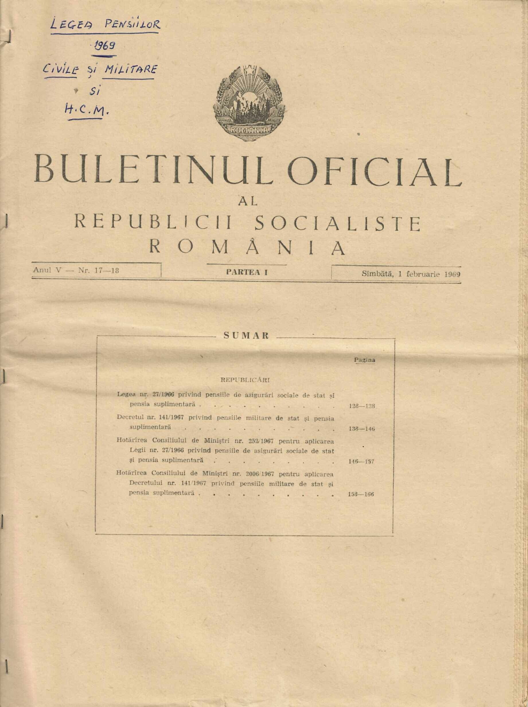 Buletinul Oficial al Republicii Socialiste România, partea I, 1 februarie 1969.