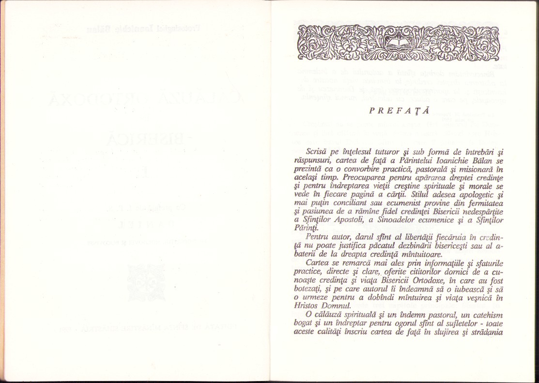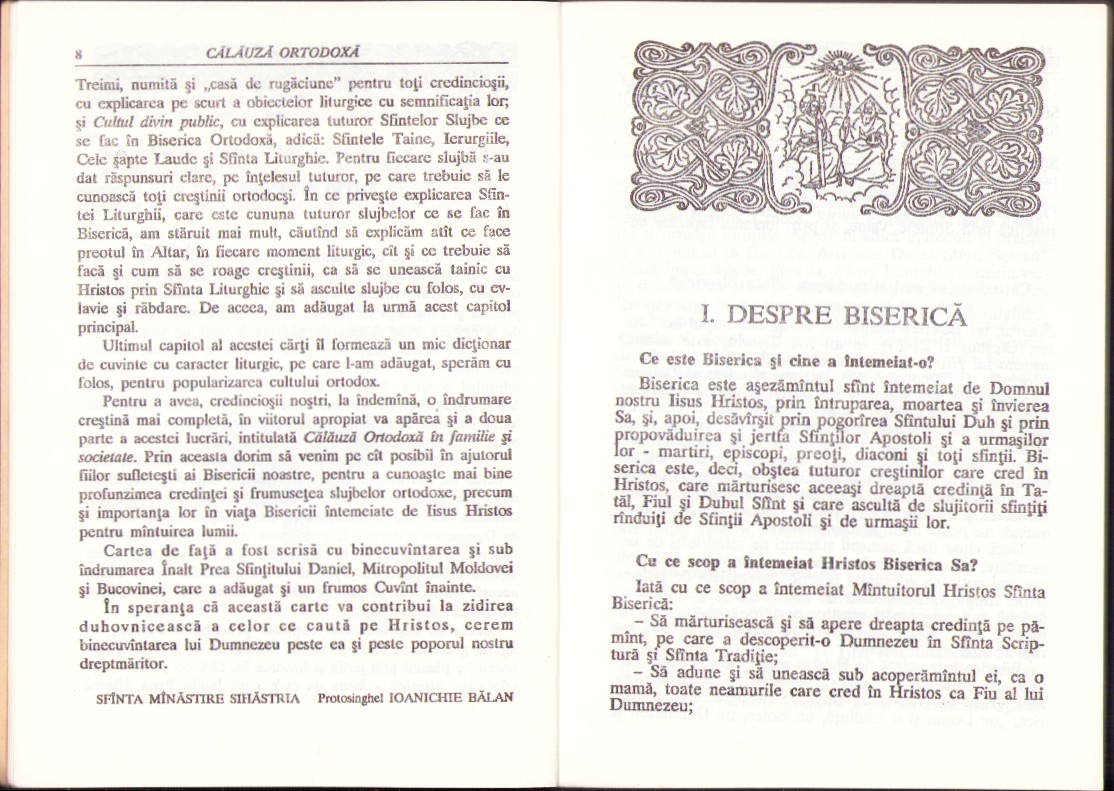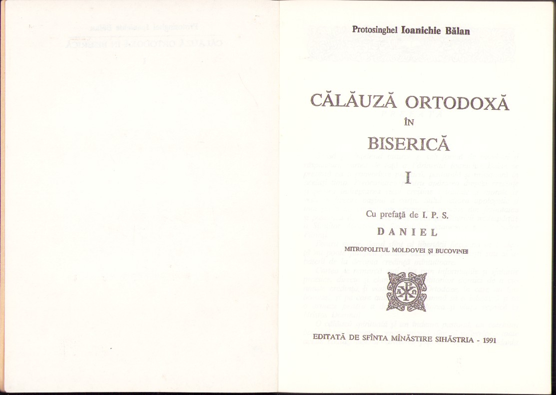 Călăuză ortodoxă în biserică, I, de protosinghel Ioanichie Bălan, cu prefață de IPS Daniel Mitropolitul Moldovei și Bucovinei, 1991, editată de Sfânta Mănăstire Sihăstria
