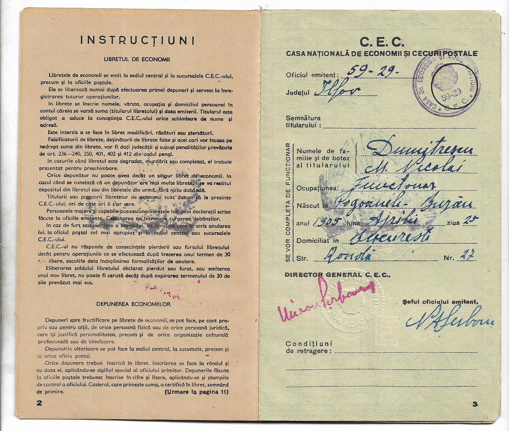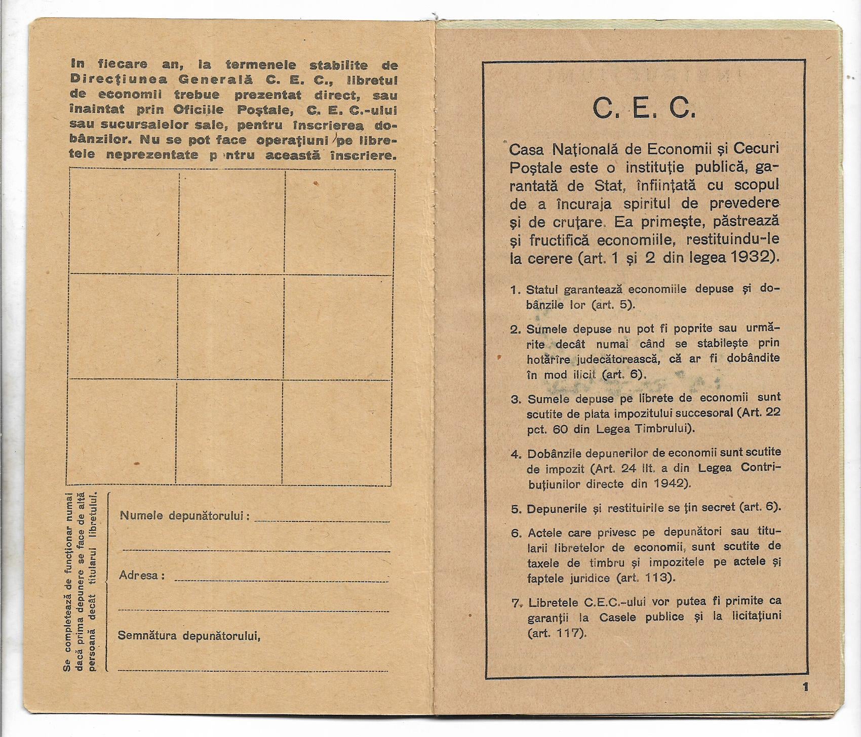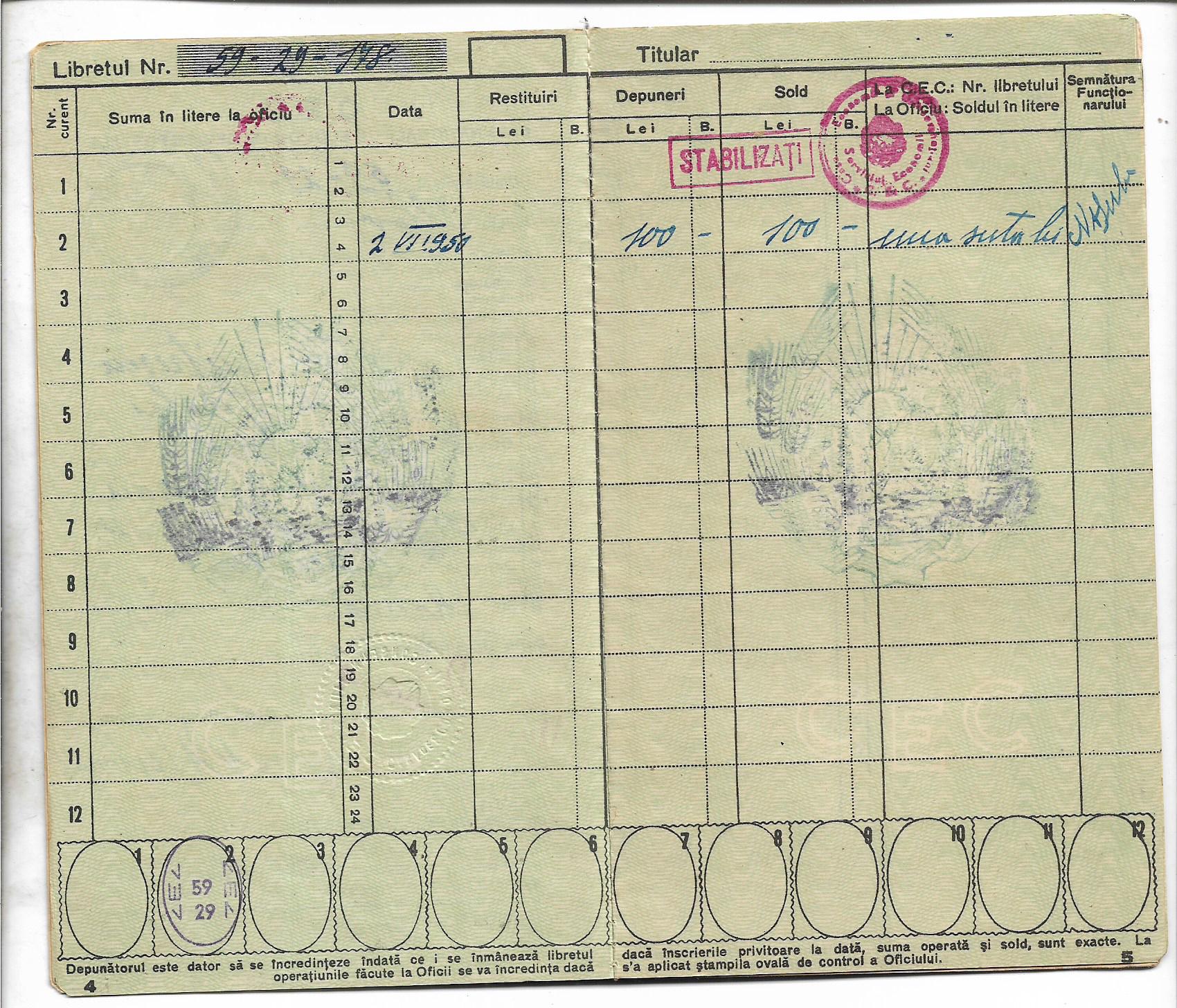 Carnet CEC cu ștampilă RPR suprapusă peste stema regală.
