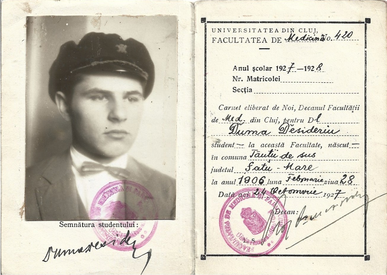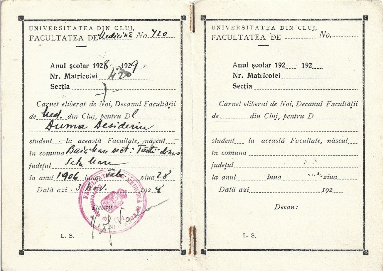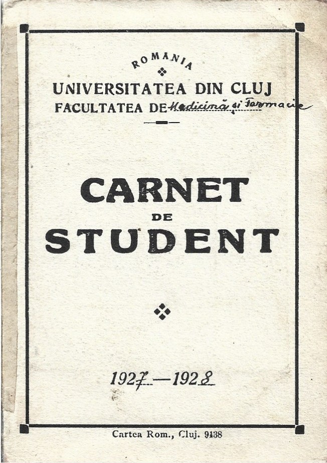 Carnet de student la Medicină, 1927, Facultatea de Medicină și Farmacie din Cluj.