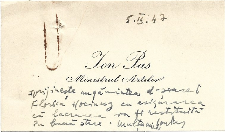 Carte de vizită Ion Pas (Calman Schritter), ministrul Artelor, 1947, cu notă și semnătură olografă a sa în favoarea sculptoriței Florica Hociung