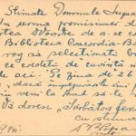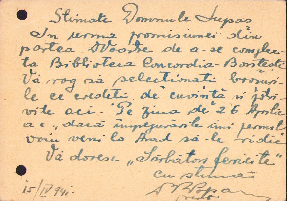 Carte poștală adresată ajutorul de primar al orașului Arad, Octavian Lupaș (istoric, primar al Aradului în 1943-1944), de către preotul Roman Popa al satului Bonțești, județul Arad, în cauza unor lucrări care să completeze biblioteca satului, aprilie 1941. Circulată Brad-Arad.
