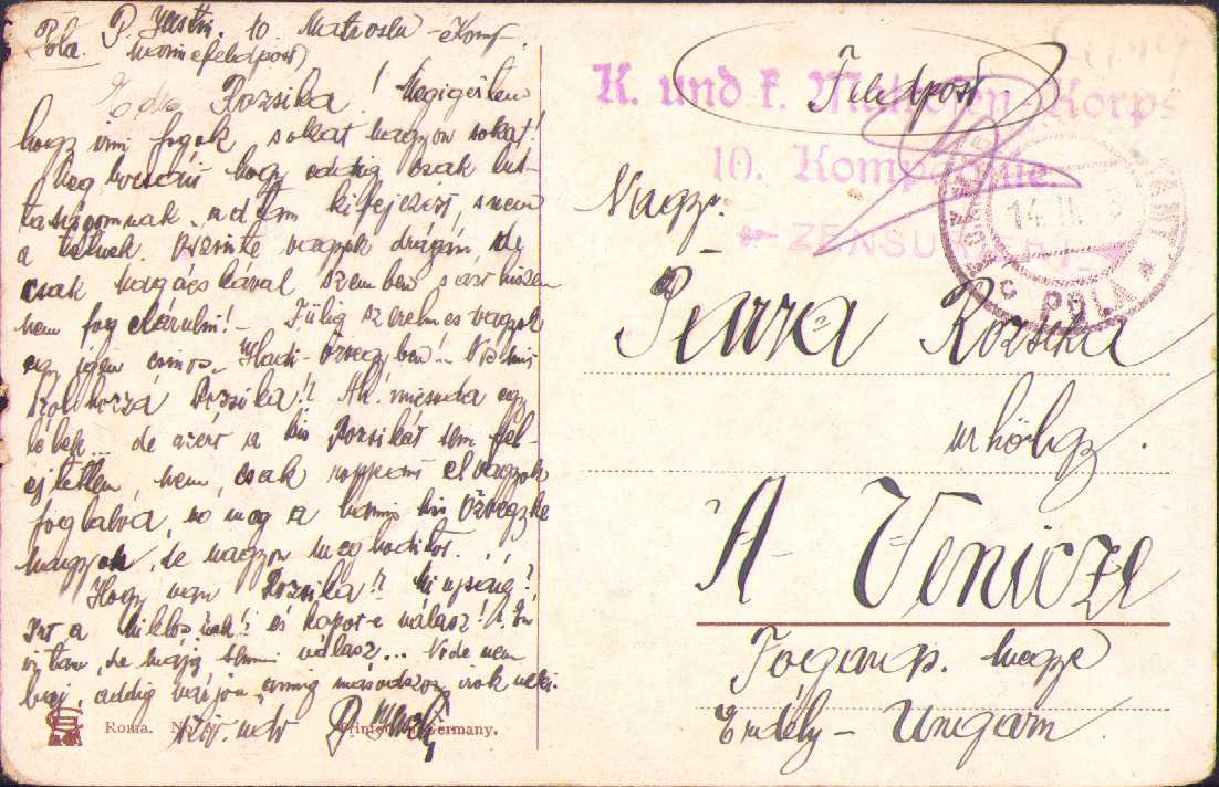 Carte poștală austro-ungară, 1918, Feldpost Pola, cu ștampilă de cenzură și de unitate militară, circulată Veneția de Jos, Primul Război Mondial
