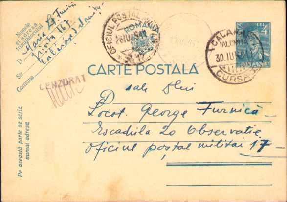 Carte poștală cu ștampila Oficiul Poștal Militar 17, Escadrila 20 Observație, iulie 1941.