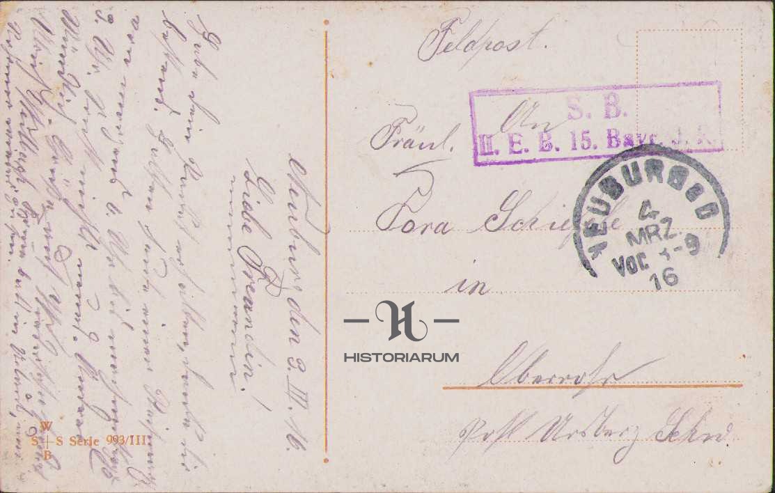 Carte poștală germană, 1916, cu ștampila 15 Bayerische Infanterie Regiment, Primul Război Mondial
