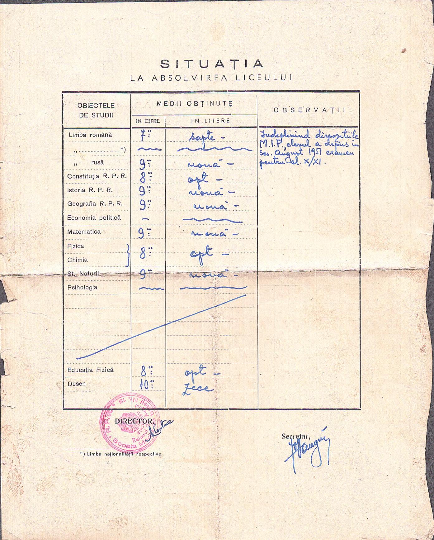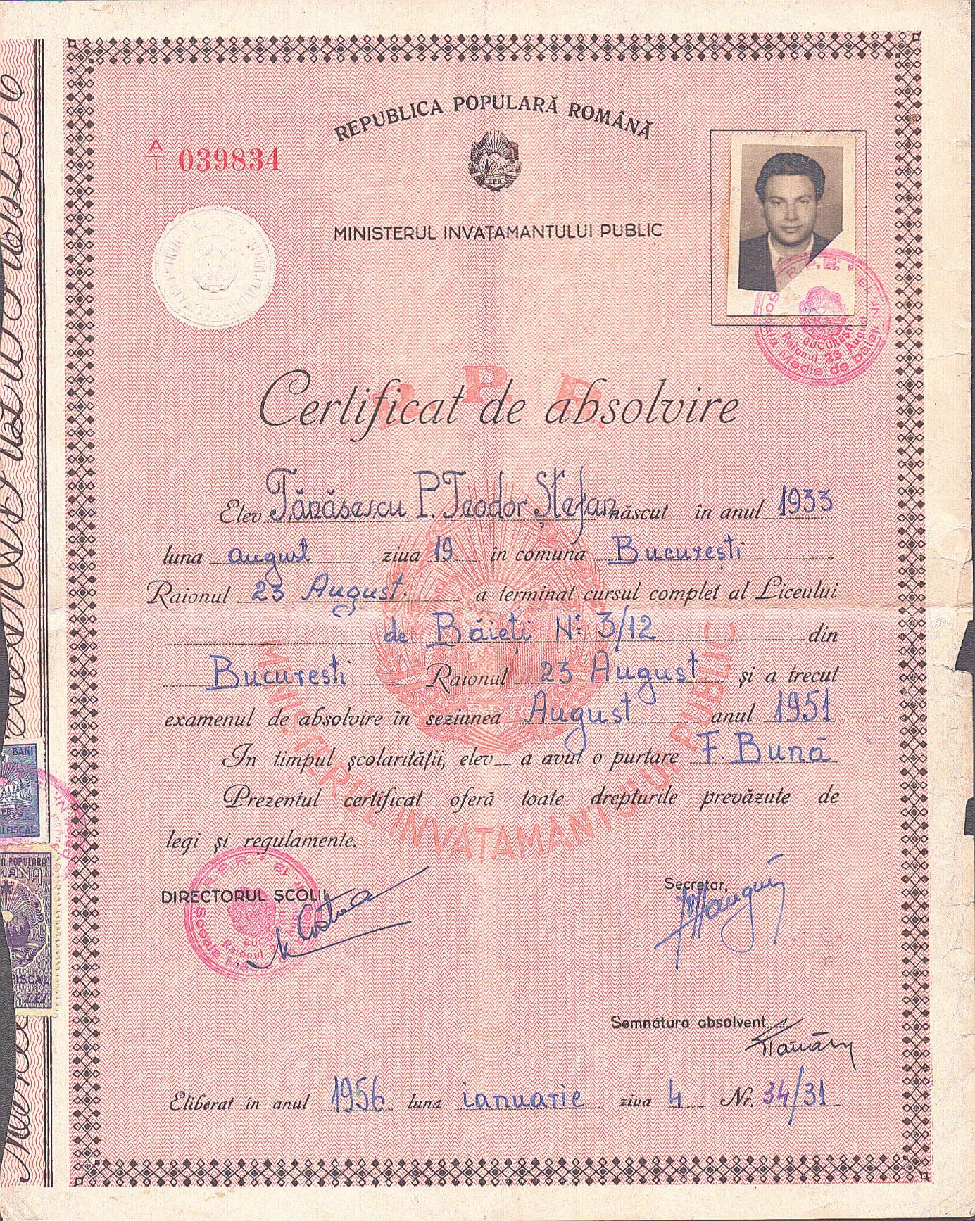Certificat de absolvire, Liceul de Băieți nr 3/12, 1956, București.