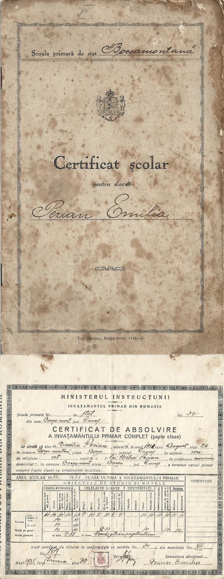 Certificat școlar pentru elevi și certificat de absolvire a învățământului primar complet (șapte clase), Școala primară de stat Bocșa Montană, 1935.