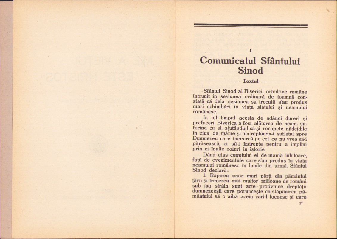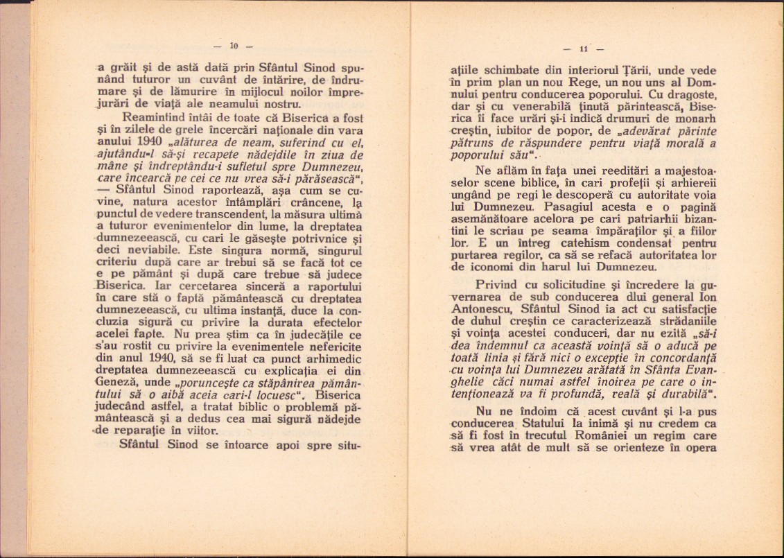 În urma rapturilor teritoriale din vara anului 1940, care a smuls României întinse suprafețe de pământ și Bisericii milioane de credincioși, în fața acestor uriașe tragedii naționale Sfântul Sinod declară prin comunicatul său că „Biserica îl înconjoară pe noul și tânărul Rege al neamului nostru, Mihai I, cu toată dragostea ei” și „asigură de toată solicitudinea și ajutorul său noua conducere a Statului Legionar în frunte cu dl general Ion Antonescu”.