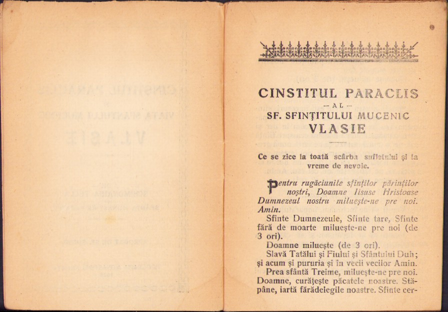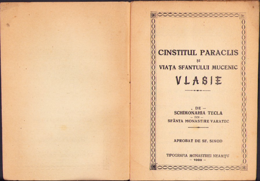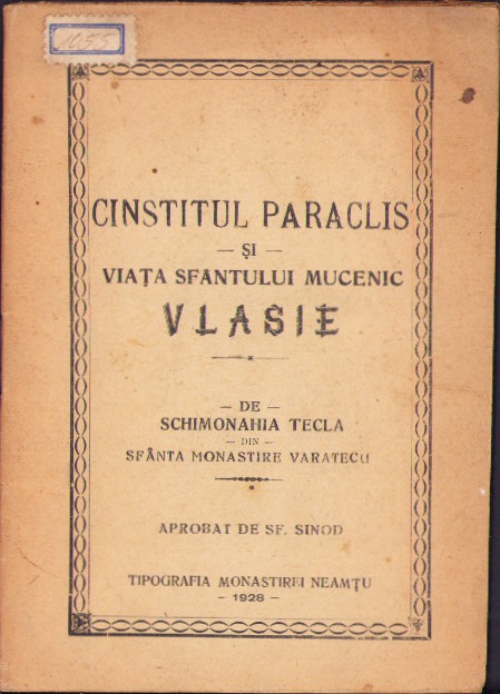 Cinstitul Paraclis și viața Sfântului Mucenic Vlasie de schimonahia Tecla din Sfânta Monastire Varatecu, aprobat de Sf Sinod, 1928, Tipografia Monastirei Neamțu.