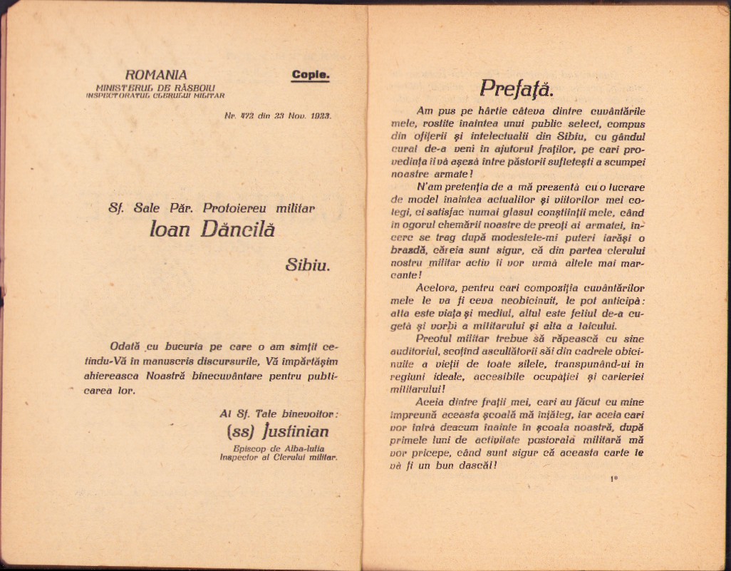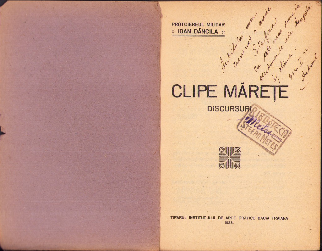 Clipe mărețe – discursuri de protoiereu militar Ioan Dăncilă, 1923, ediția I, cu dedicația olografă a autorului către istoricul Ștefan Meteș și cu semnătura olografă și ex-libris a acestuia din urmă.