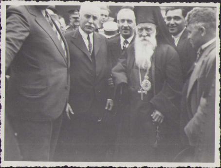 De la stânga la dreapta: Constantin Angelescu, ministrul Instrucțiunii Publice, colonel Gheoghe Bacaloglu, episcop Roman Ciorogariu la Oradea, circa 1934. În fundal, generalul Ilie Ilcuș, comandantul garnizoanei Oradea.