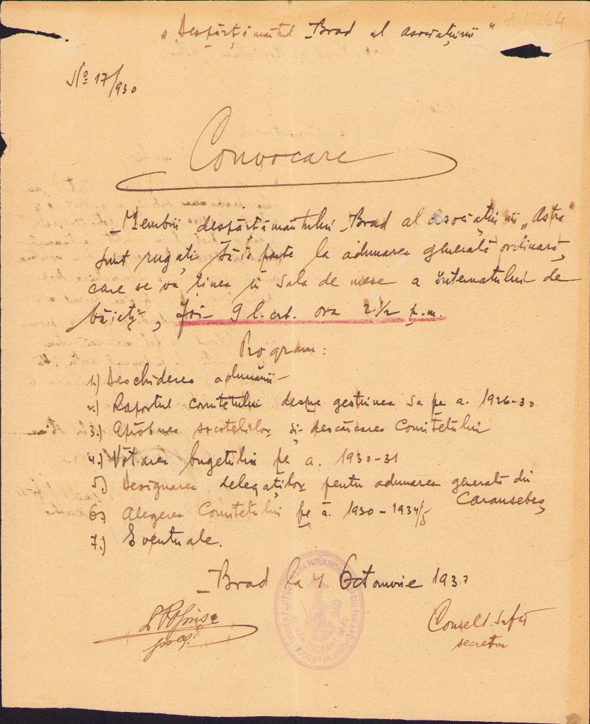 Convocare ASTRA Brad județul Hunedoara, 1930