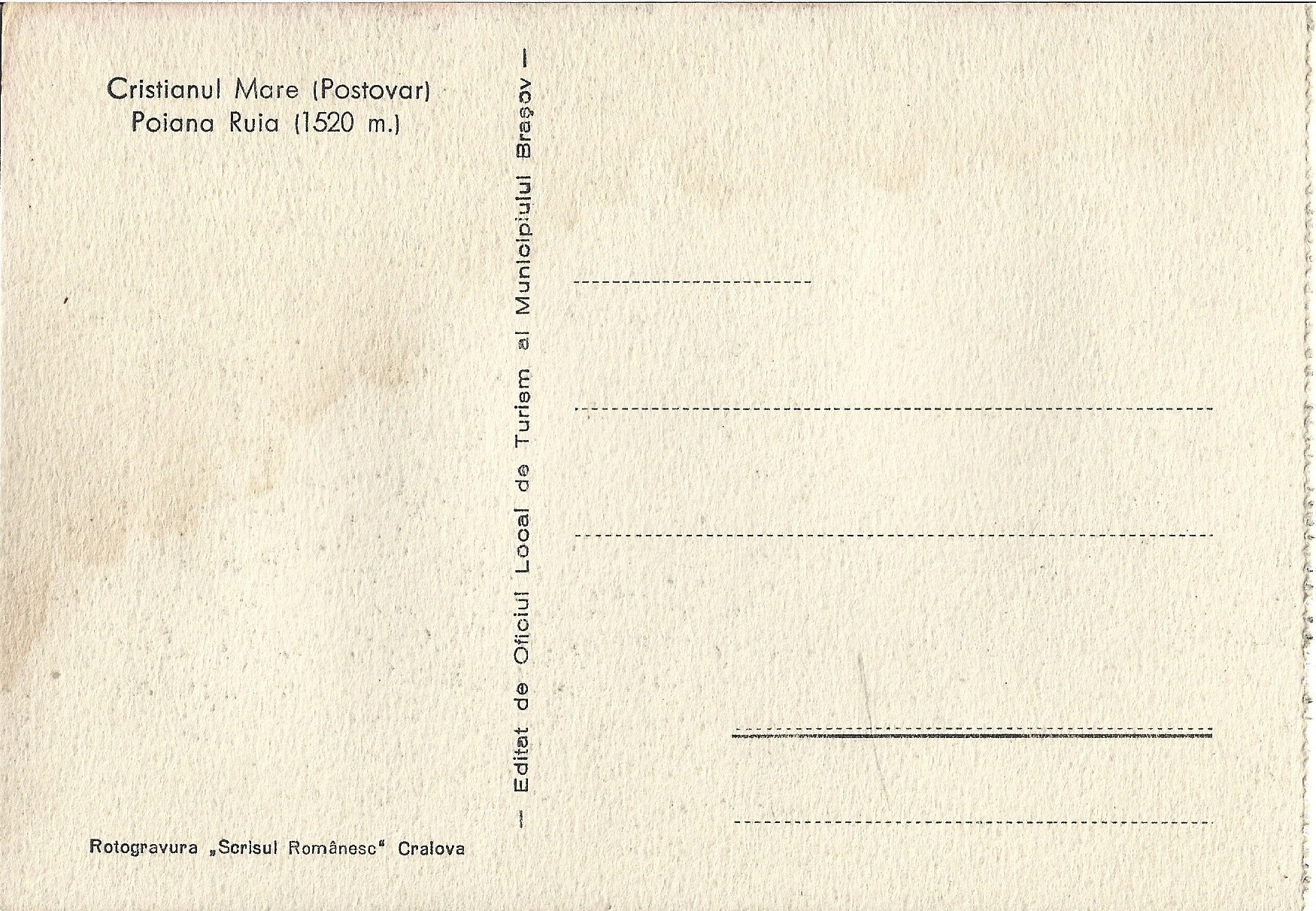 Cristianul Mare (Postovar) Poiana Ruia (1520 m), editată de Oficiul Local de Turism al Municipiului Brașov, necirculată.