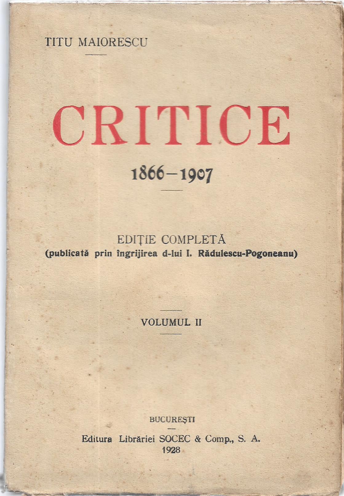 Critice, 1866 – 1907 de Titu Maiorescu, volumul II, 1928.