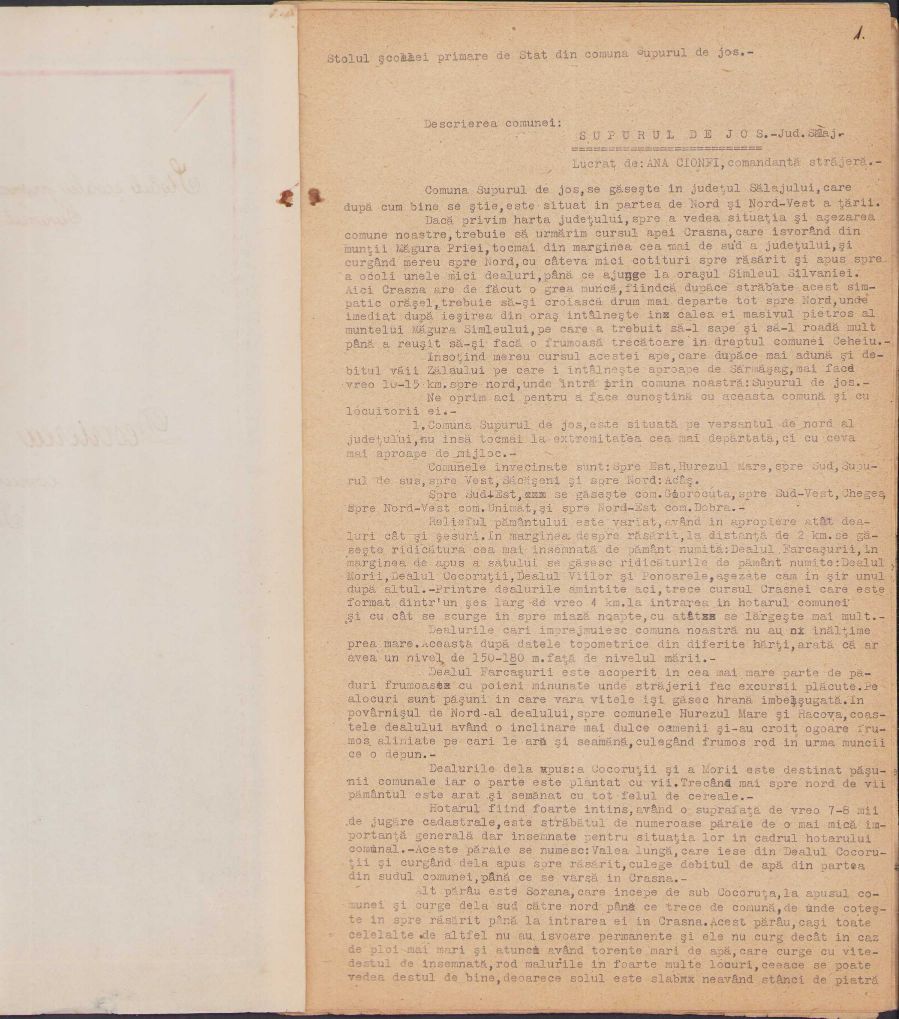 Descrierea comunei Supurul de Jos. Jud. Sălaj (azi în județul Satu Mare) de Ana Cionfi, învățătoare, comandata stolului din localitate, Straja Țării, 1940.