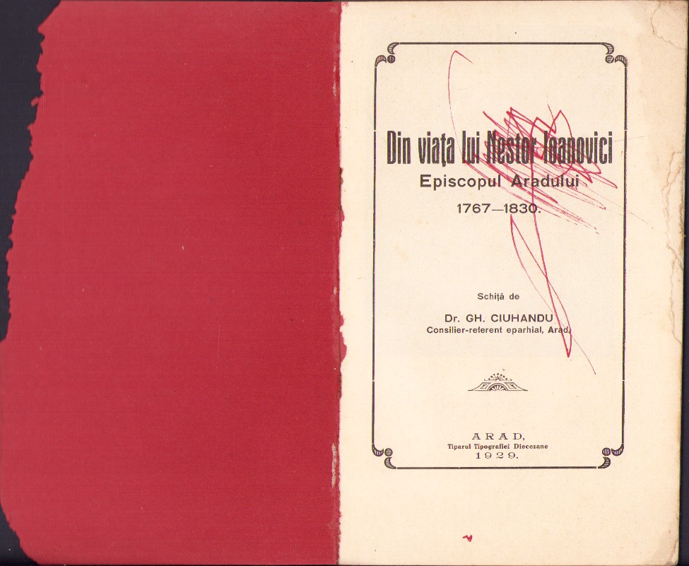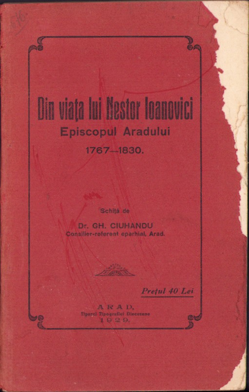 Din viața lui Nestor Ioanovici Episcopul Aradului, schiță de Gheorghe Ciuhandu, 1929, Arad, Tiparul Tipografiei Diecezane.