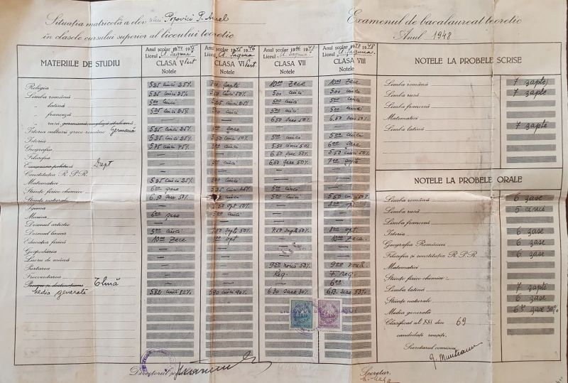 Diplomă de bacalaureat Liceul teoretic de băieți Brașov, R.P.R., 1949