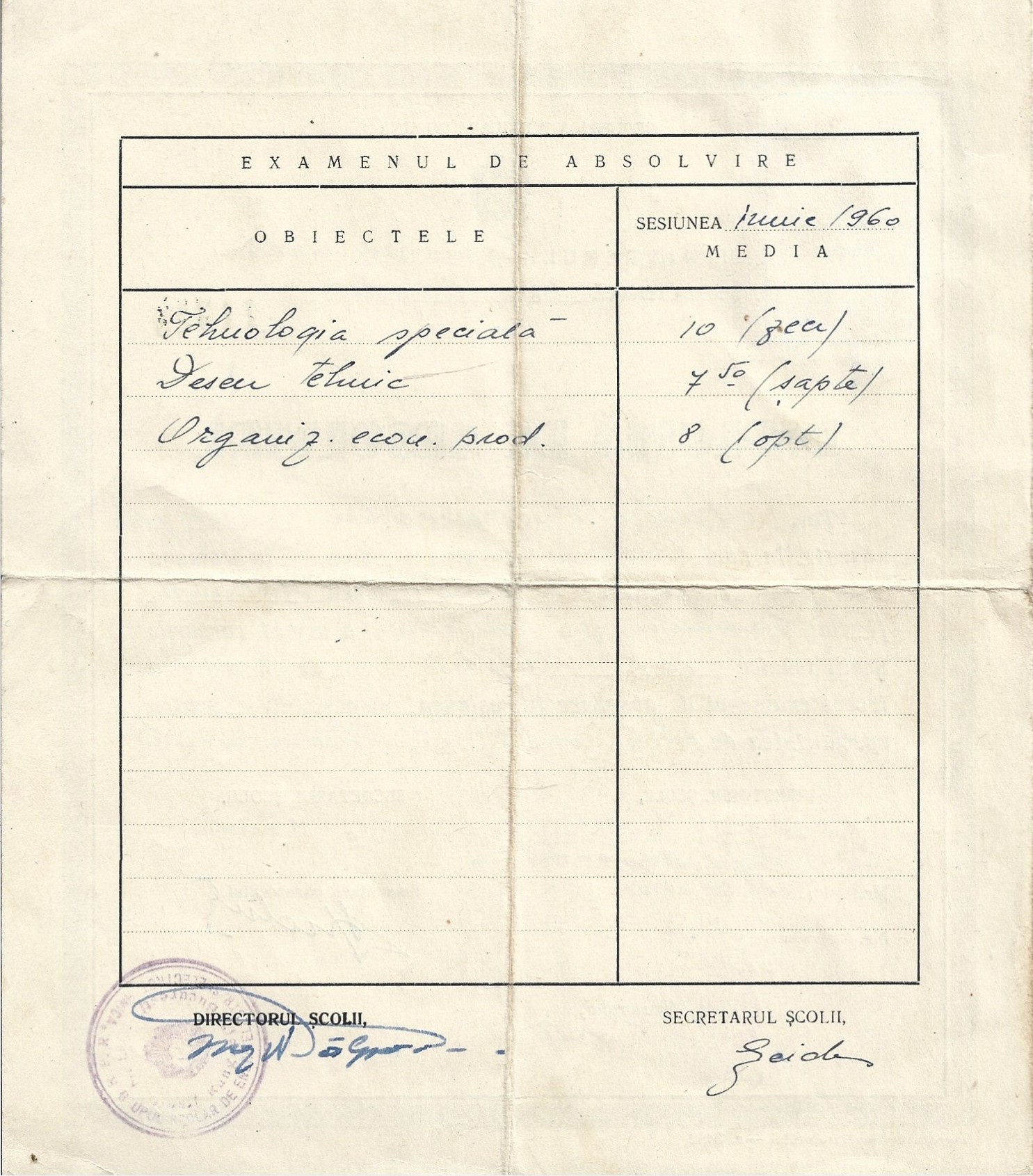 Diplomă de electronist constructor aparate telecomunicații, Școala tehnică Iosif Rangheț, București, 1960.
