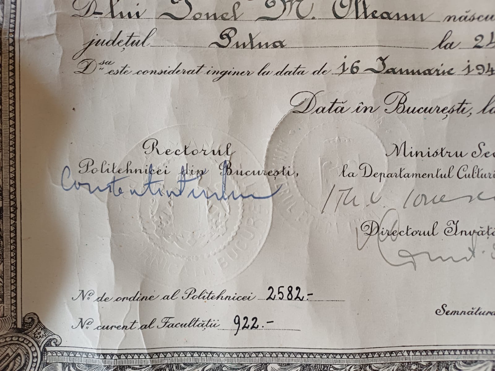 Diplomă de inginer electromecanic, 1944, Politehnica din București, absolvent originar din Focșani.
