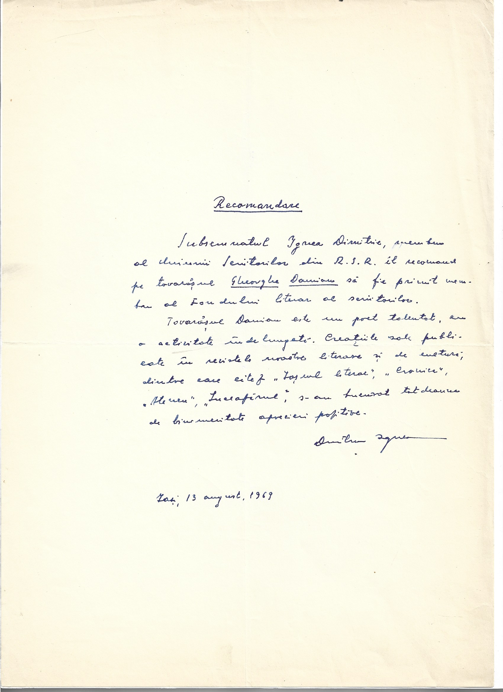 Document scris și semnat olograf de Dimitrie Ignea (Dumitru Ignea), 1969, Iași.