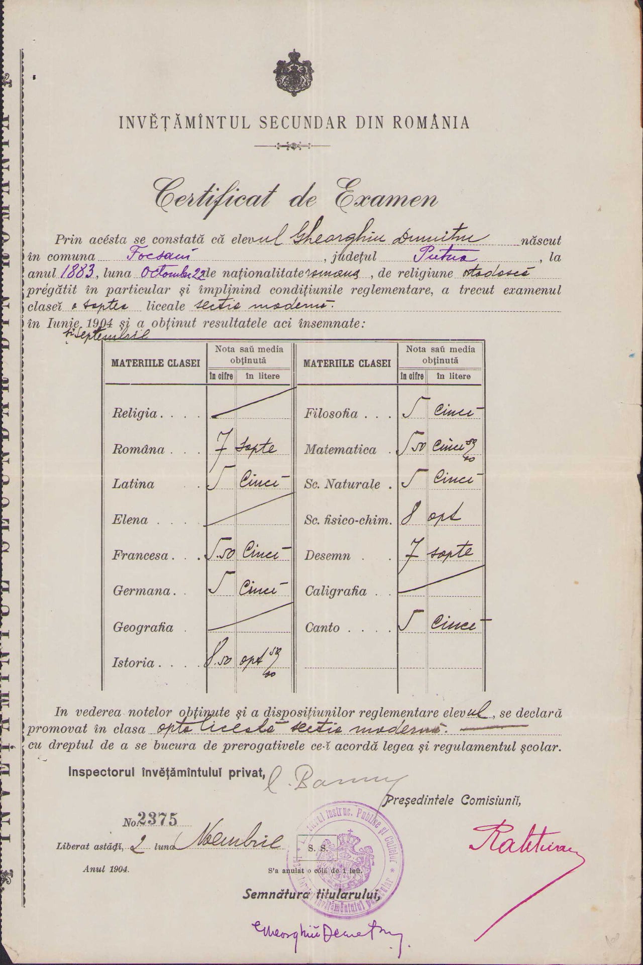 Două certificate de examen pentru un elev din Focșani pregătit în particular, anii 1903 și 1904.