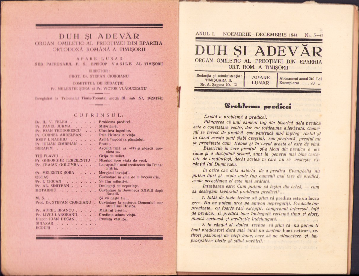 Duh și adevăr 5-6/1941 Organ omiletic al preoțimei din eparhia ortodoxă română a Timișorii.
