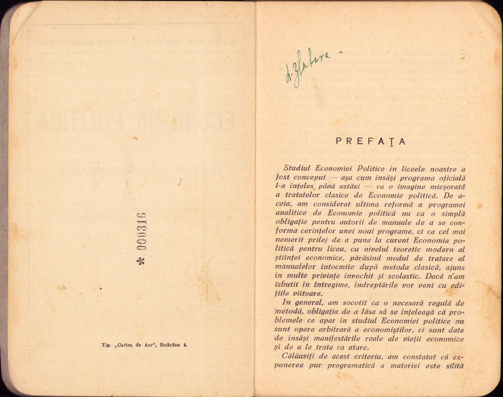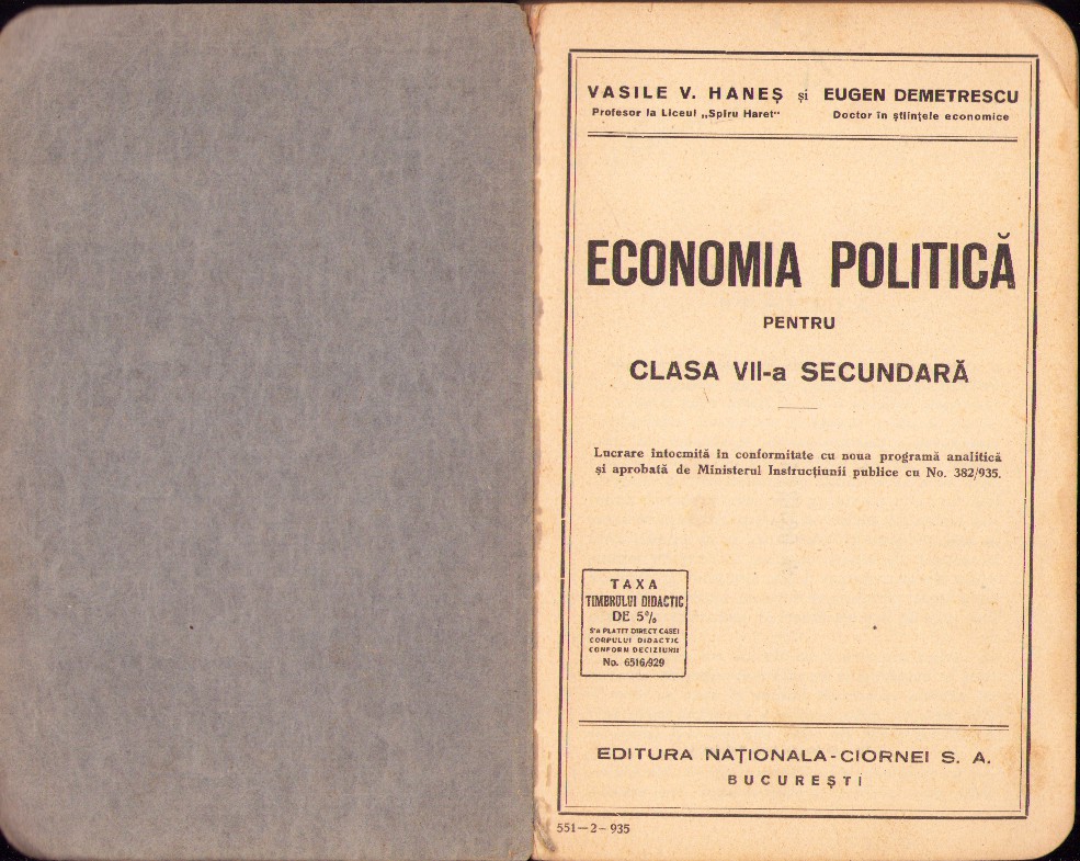 Economia politică pentru clasa VII-a secundată de Vasile Haneș și Eugen Demetrescu, 1935.