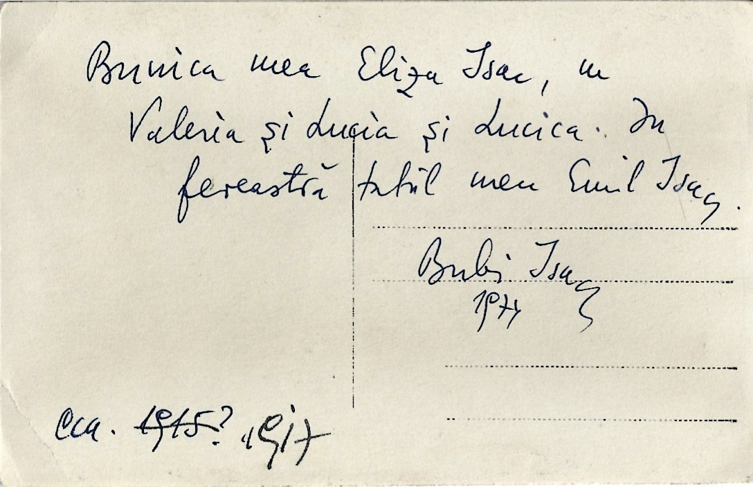 Nota de pe spatele fotografiei, datată 1974, aparține lui Gheorghe „Bubi” Isac, fiul lui Emil Isac.